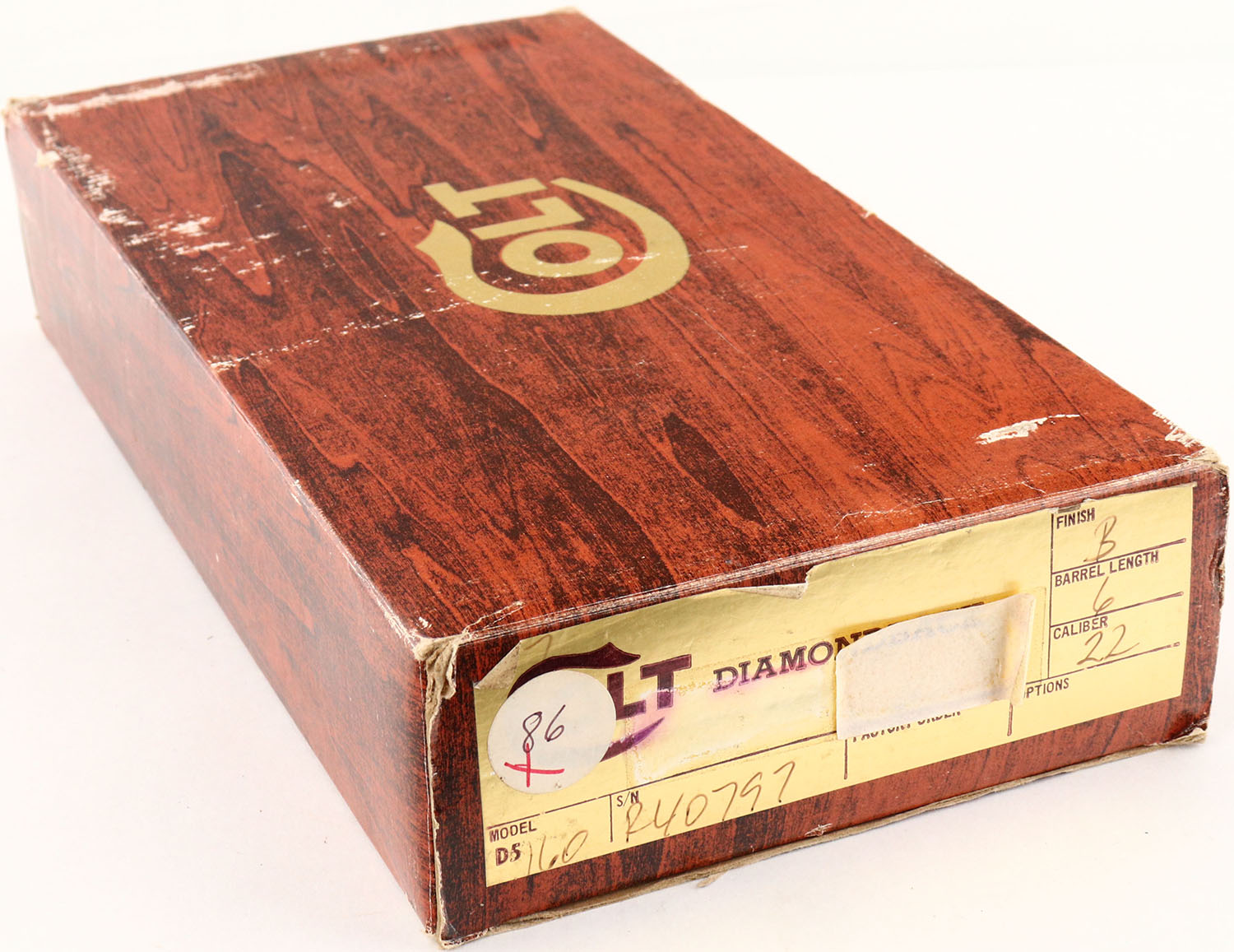 BOXED, Colt, Diamondback, CAL: 22LR, MFG: 1978/79, SN: R40797, Double Action Revolver, 6'' barrel. The Colt Diamondback was introduced as a deluxe model in 1966, inspired by the successful Colt Python, in calibers of .22 LR, .22 WMR & .38 SPL. The Diamondback is built on the smaller ''D frame'', same as used in the Detective Special. It has a 6-shot swing-out cylinder & was available in blue or nickel finishes. It has a wide serrated target hammer, ventilated rib, fully adjustable target quality sights, & full-length barrel underlug. The left side of barrel is stamped ''DIAMONDBACK .22 LONG RIFLE''. They came with Gold tone Colt medallions in the checkered Walnut grips. The grips on this example are excellent, with a small glue repaired edge chip on the top front side of the right grip. The high polish blued finish rates 99%. Bore is near mint. The satin finished top of the ventilated rib barrel holds a screw height adjusting ''U'' notch rear sight & front blade sight. Original hang tag still present on the trigger guard. Comes in the original SN matching Colt wood grain box, with related paperwork. Box has some edge, corner & shelf wear. A highly collectible Colt revolver. FFL Req. - Value: 1500 to 2000