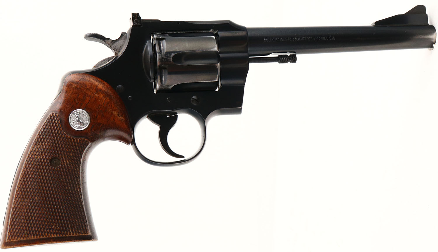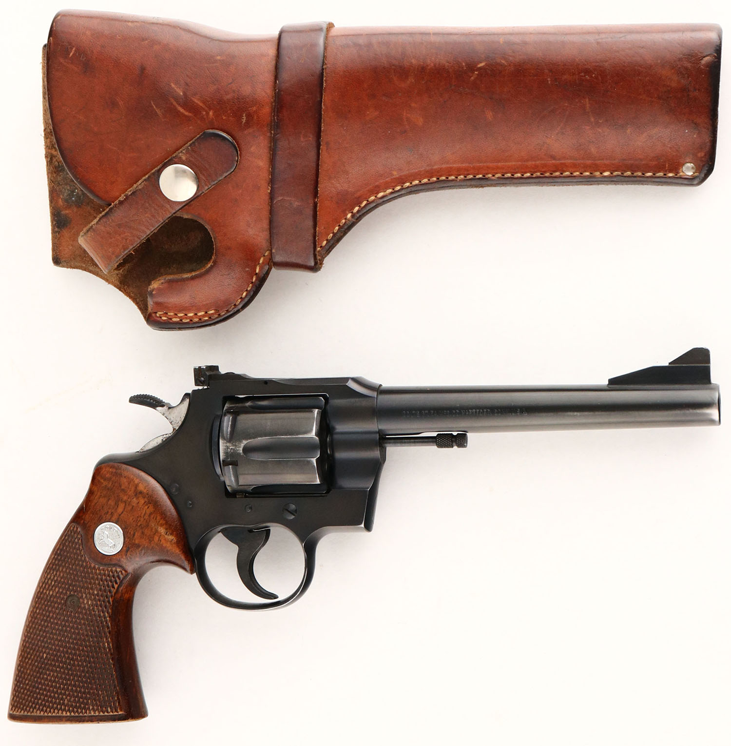 Colt, Trooper .357, CAL: .357 MAG, MFG: 1966, SN: 52831, Double Action Revolver. 6'' barrel. The Colt logo medallion & checkered target style grips are excellent. There are minor handling marks & spots of thinning finish near the butt. The original metal blue finish rate 90% on the barrel & 97% on the frame. There is some holster wear to the muzzle, barrel & cylinder edges. Bore is excellent. Adjustable rear sight & ramp elevated serrated blade front sight. Comes with a leather holster marked ''CASCADE MERC. SPORTING GOODS SALEM, OREGON'', over ''96 MAGNUM 6 1/2''. A nice example of an original Colt Trooper. FFL or C&R Req. - Value: 550 to 750