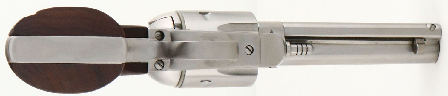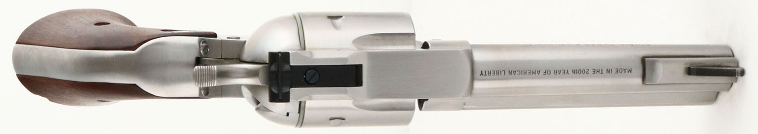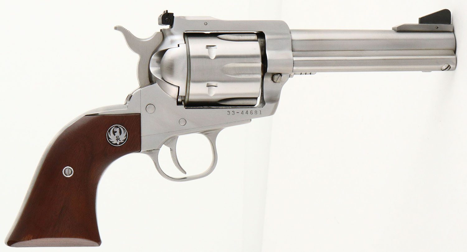 BOXED, Ruger, New Model Blackhawk, CAL: 357 MAG, MFG: 1976, SN: 33-44681, Single Action Revolver, 4 5/8'' barrel. The Ruger logo medallion wood grips are mint. The stainless steel finish is excellent. Bore is mint. Adjustable rear sight & elevated serrated blade front sight. The plastic cylinder disc is still present. Comes in factory SN matching box, with related paperwork, original packaging & outer cardboard sleeve. FFL Req. - Value: 600 to 900
