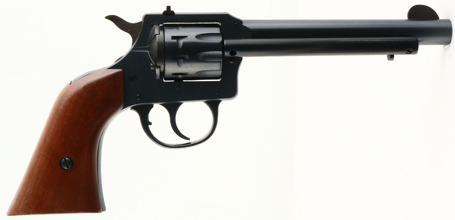 BOXED, Harrington & Richardson, Model 949 ''Forty Niner'' Second Model, CAL: 22, MFG: 1973-86, SN: AN65286, Double Action Revolver, 5 1/2'' barrel. The second model is identical to the first model, except the second model has a safety transfer bar. The wood grips are excellent. The metal blue finish rates 99% overall. Bore is excellent. Square notch rear sight & large blade front sight. Comes in factory SN matching box, with owners manual. FFL Req. - Value: 150 to 250