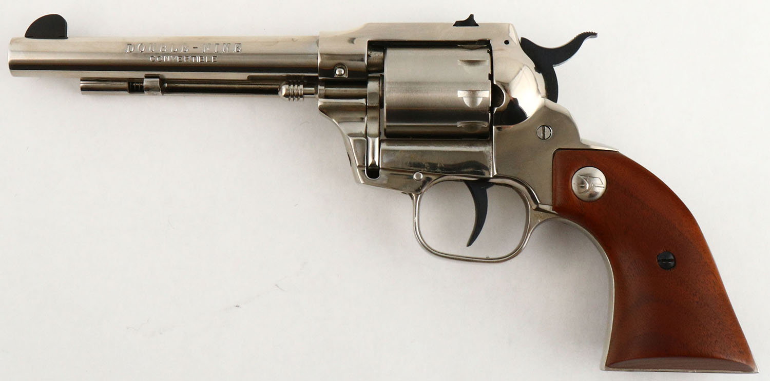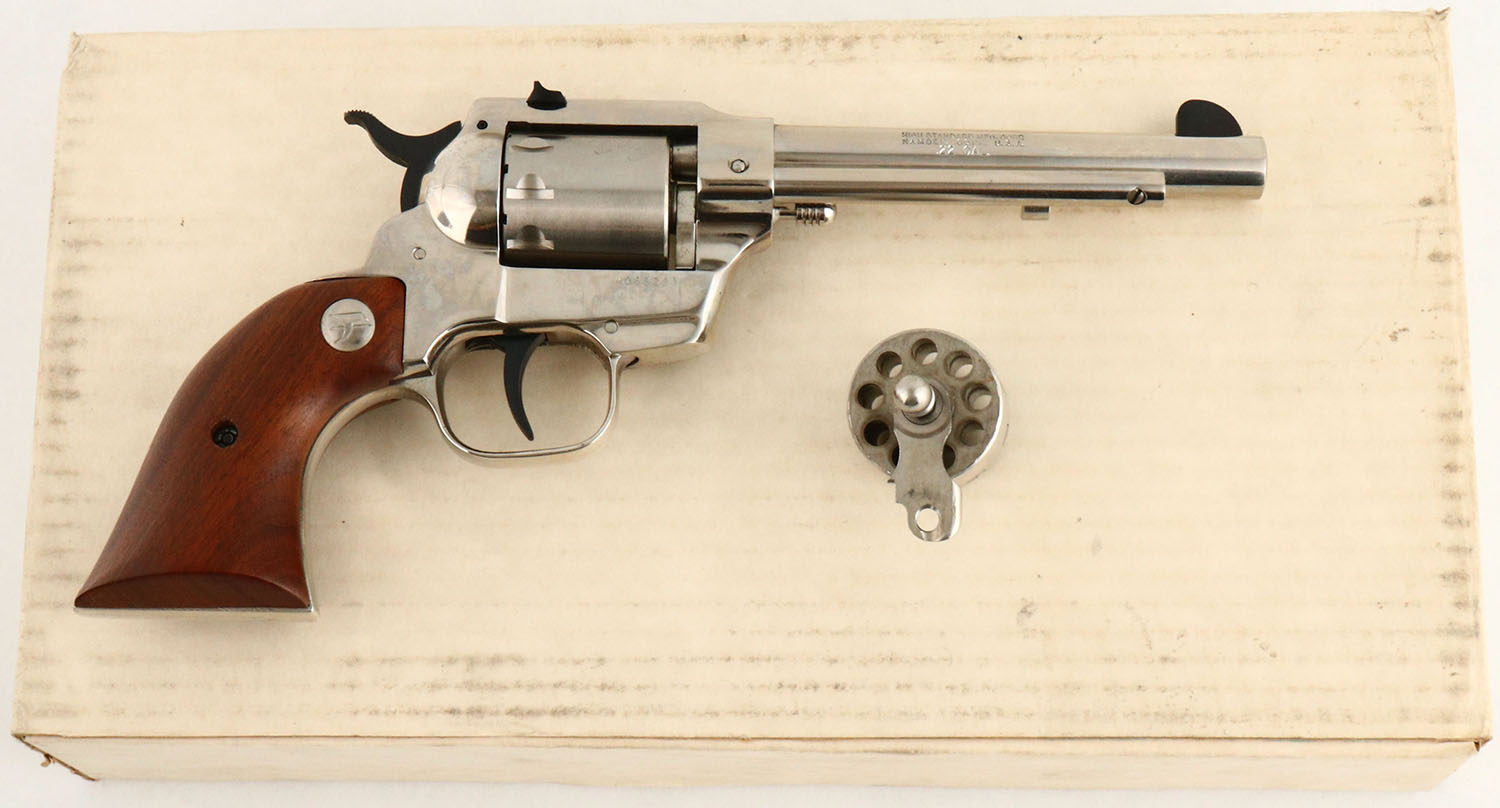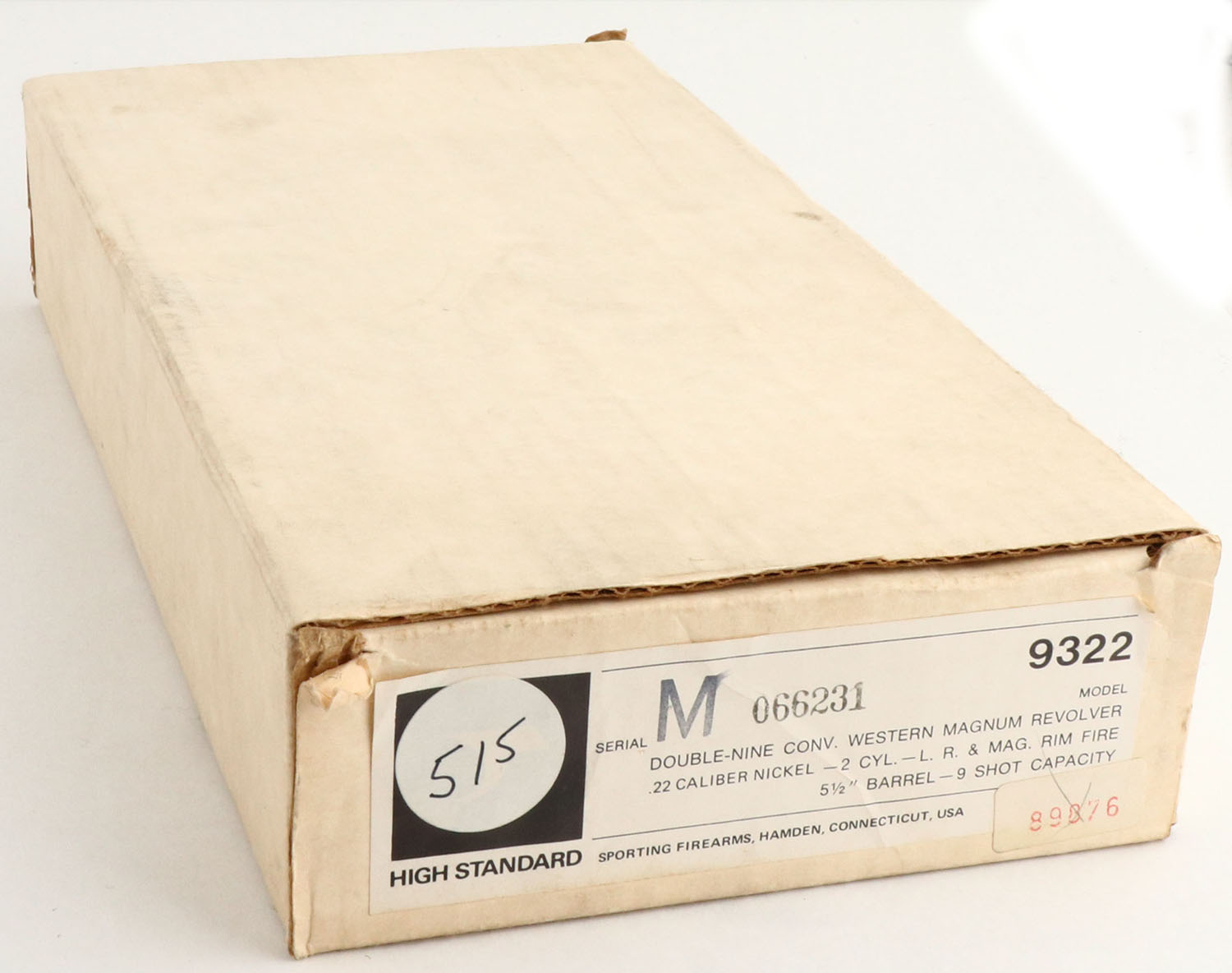 NEW BOXED, High Standard, Double-Nine Convertible, CAL: .22 LR/.22 MAG, MFG: 1960's, SN: M066231, Double Action Revolver, 5 1/2'' barrel. The HS logo medallion wood grips are mint. The original nickel finish is excellent overall. This revolver was removed from it's original packaging & has some remnants of factory grease throughout. Bore is mint. Square notch rear sight & large dorsal fin blade front sight. Comes in factory SN matching box, with extra cylinder, related paperwork & original packaging. FFL or C&R Req. - Value: 300 to 600