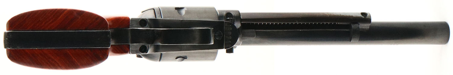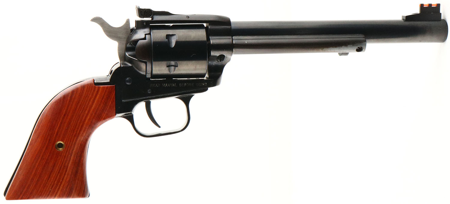 Heritage Mfg. Co., Heritage Rough Rider, CAL: 22 MAG, MFG: Modern, J86216, Single Action Revolver, 6 1/2'' barrel. The wood grips are excellent, with minor handling marks. The metal blue finish on the barrel rates 99% & the matte black finish on the frame rates 95%. Bore is excellent. Adjustable square notch rear sight & orange fiber optic rail front sight. FFL Req. - Value: 100 to 200