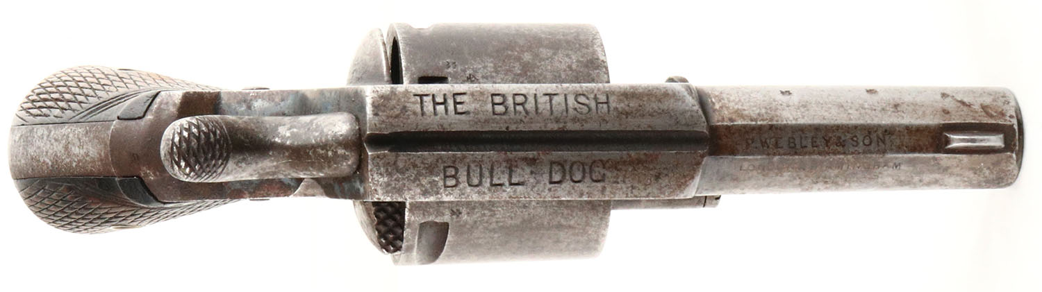 P. Webley & Son, The British Bull Dog, CAL: 44 Webley? (cal not marked), MFG: 1880's, SN: N/A, Double Action Revolver, 2 1/2'' barrel. The top of the barrel is marked ''P.WEBLEY & SON'', the right side of the barrel is marked ''LONDON & BIRMINGHAM''. The top of the frame is marked in two lines ''THE BRITISH BULL DOG''. The body of the cylinder is stamped ''444''. There are numerous British proofs throughout the revolver. The original checkered wood grips are very good & solid. There are some scrapes & dings, with checkering beginning to smooth towards the bottom of both grips. The original metal blue finish rates 10% overall, mostly worn to metal gray & toned to a brown patina, with consistent spotting & speckling throughout. Bore is good, with roughness & intermittent light pitting. Integral v-notch rear sight & blade front sight. Caliber Comment: we have loaded both a 44 Bull Dog & 44 Webley into the cylinder, the 44 Webley cartridge overall fits better than the 44 Bull Dog. We did not have a .442 CF to try. Measurements by request. Antique, No FFL Req. - Value: 200 to 450