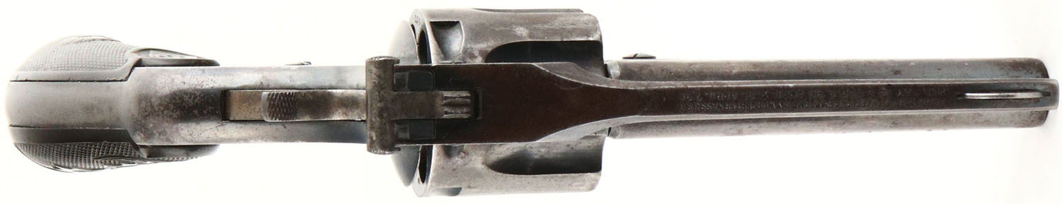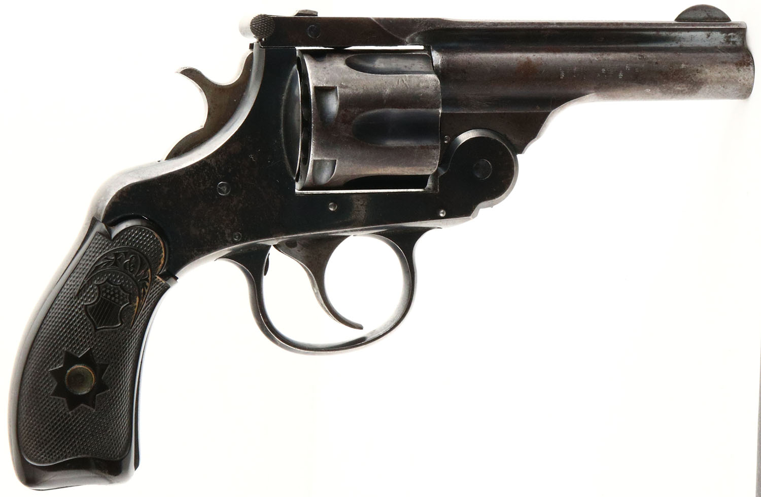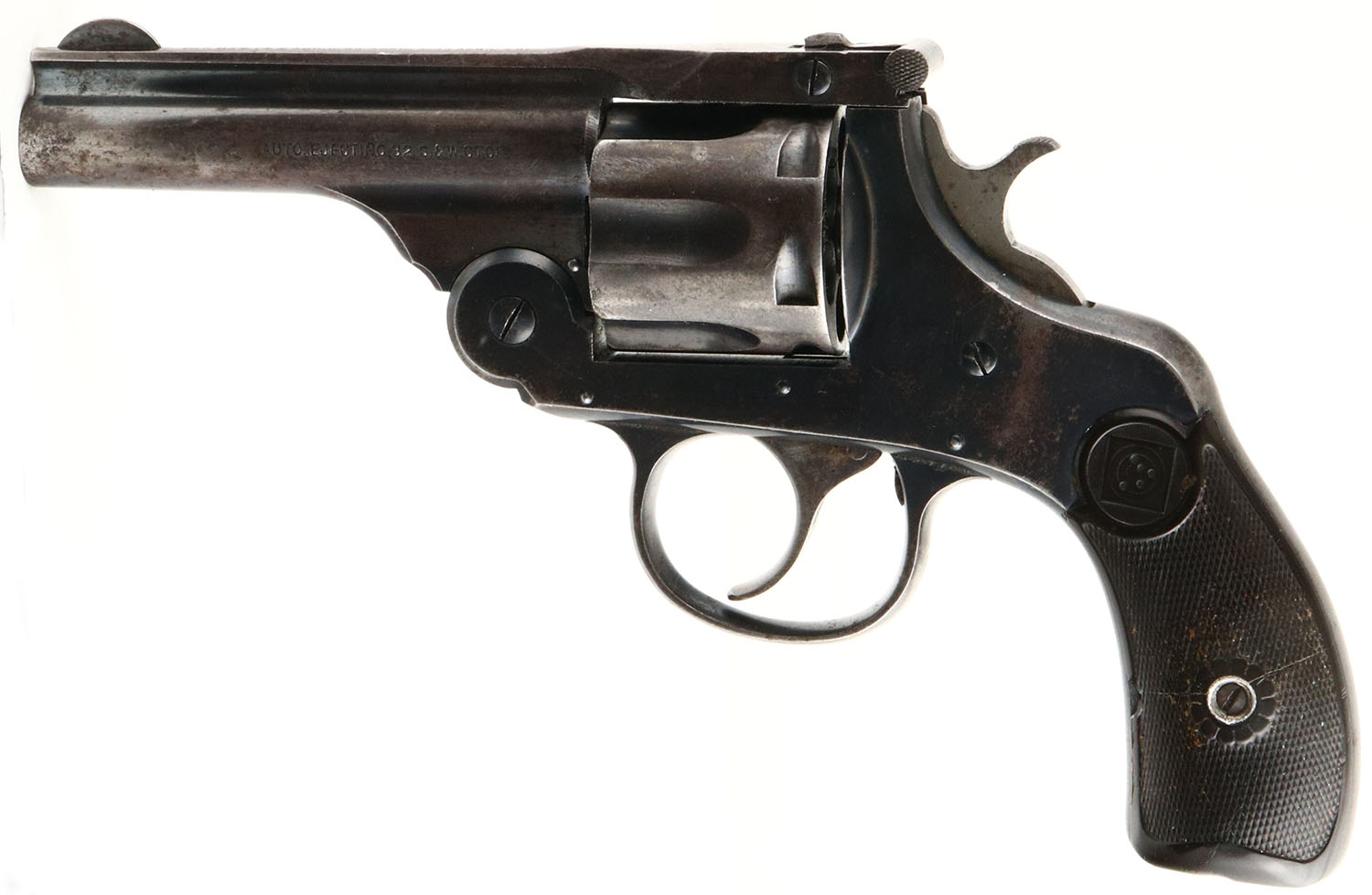 Harrington & Richardson, Top Break Automatic Ejecting Model 3 - First Variation, CAL: 38 S&W, MFG: 1905-08, SN: 164129, Double Action Revolver, 3 1/4'' barrel. The mismatched Target logo & F&W checkered hard rubber grips are fair, the left grip has a crack through the middle & an edge chip. The F&W right grip has a sizeable chip at the butt. The metal blue finish on the barrel has worn to a mix of metal gray, brown patina & remaining blue in protected areas. The frame rates 60% with concentrated loss to the straps & consistent spotting toned a brown patina. Bore is good & clean, with consistent roughness & light pitting. Notch rear sight & blade front sight. Top break latch moves freely, likely an internal parts issue. FFL or C&R Req. - Value: 100 to 150