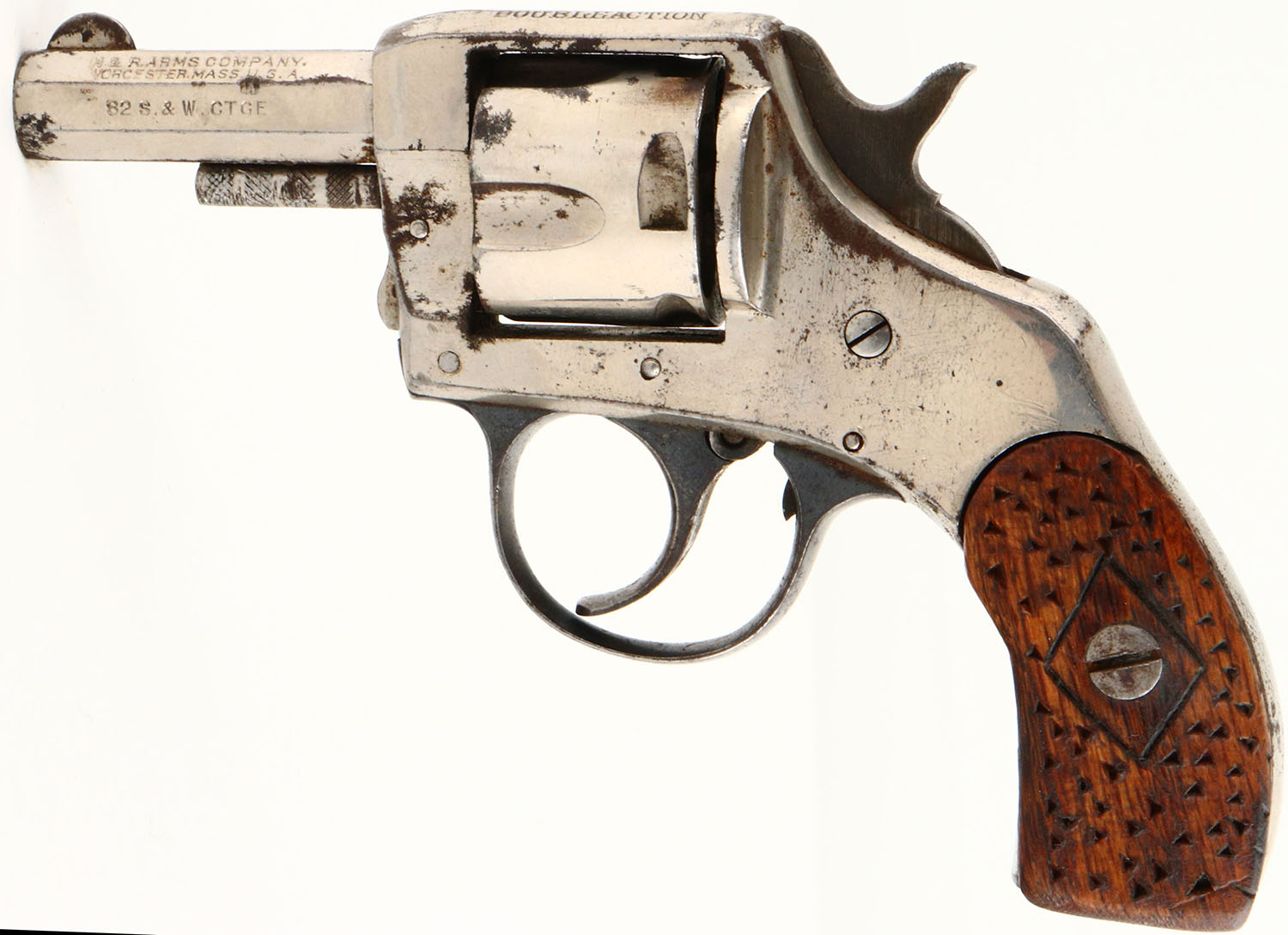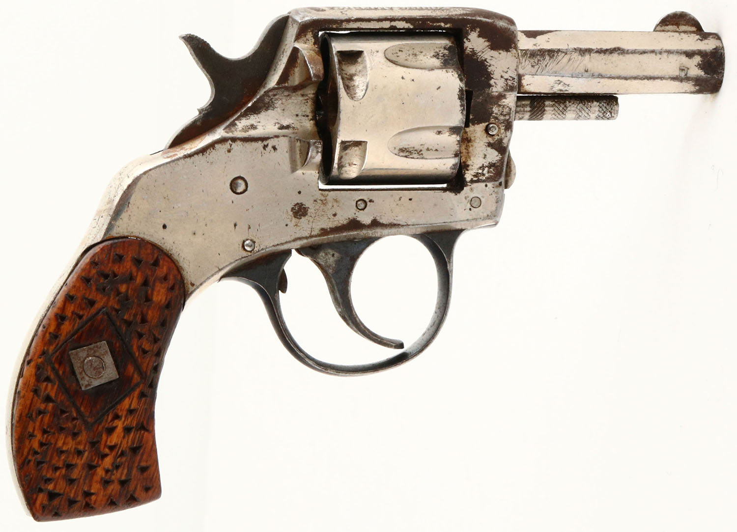 Harrington & Richardson, Young America D.A 1st Model - Third Variation, CAL: 32 S&W, MFG: 1905-41, SN: 273015, Double Action Revolver, 2'' barrel. The customized wood grips are excellent & solid. The grips have been notched with a triangle shape tool & have a hand etched diamond around the replacement screw. The nickel finish rates 80% overall, with areas worn to metal gray & toned to a brown patina. There is a small amount of rust around the hammer. Bore is good & bright, with roughness & intermittent pitting. Blade front sight. FFL or C&R Req. - Value: 50 to 200