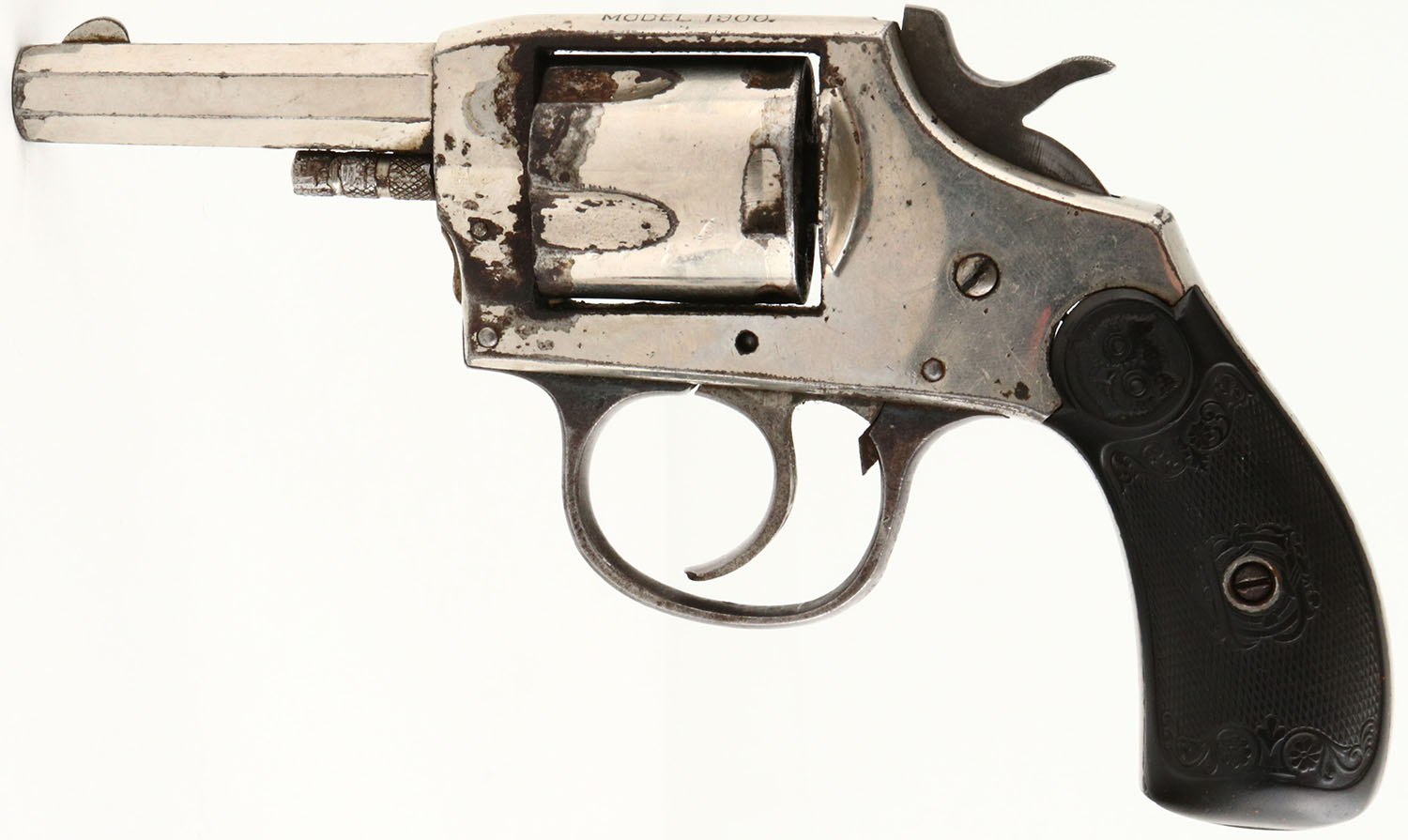 Iver Johnson, Model 1900, CAL: 32RF, MFG: 1900-41, SN: 8007, Double Action Revolver, 2 1/2'' barrel. The IJ owl head checkered hard rubber grips are excellent. There are minor handling marks. The nickel finish rates 80% overall, with intermittent flaking & concentrated in front of the cylinder. Bore is good & bright, with intermittent roughness & pitting. Integral notch rear sight & blade front sight. FFL or C&R Req. - Value: 50 to 150