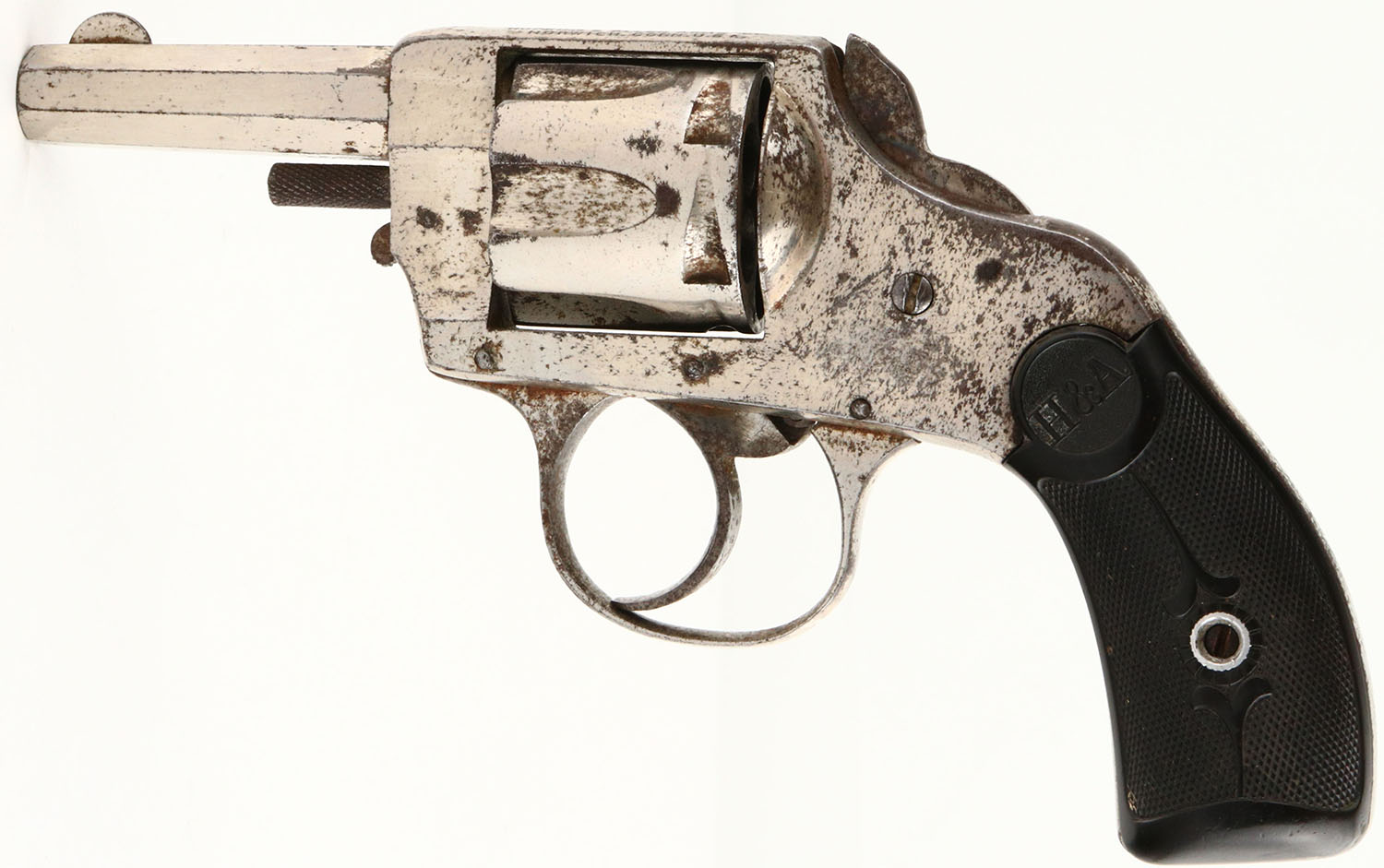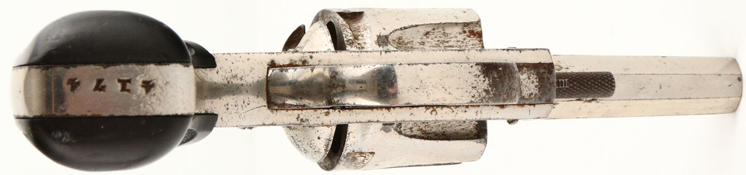 Hopkins & Allen, Double Action No.6, CAL: 32, MFG: circa 1890's, SN: 4174, Double Action Revolver, 2 1/2'' barrel. The H&A checkered hard rubber grips are excellent. There are minor contusions, nicks & dings. The nickel finish rates 80% overall, with consistent spotting toned to a brown patina. Bore is good & bright, with roughness & intermittent pitting. Notch rear sight & blade front sight. Hammer spur missing, ground smooth & tip of hammer checkered. Multiple issues with mechanical operation. Needs to be inspected by a licensed gunsmith before operation. SOLD AS IS- NO RETURNS. Antique, No FFL Req. - Value: 50 to 150