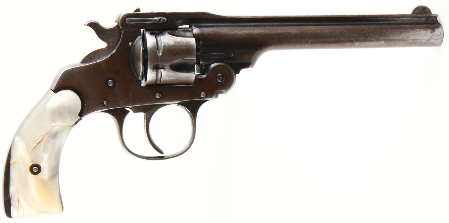 Hopkins & Allen, Safety Police, CAL: 32 S&W, MFG: 1908-15, SN: 3159, Double Action Revolver, 5'' barrel. The Mother of Pearl grips are good overall. The left grip is very good, with only a couple small edge chips & the right grip is fair, with a large chip off the back side & a crack running through most of the grip. The metal blue finish has worn to a mix of metal gray, brown patina & remnants of original blue in protected areas. Bore is very good & bright, with intermittent roughness. Small V-notch rear sight & blade front sight. FFL or C&R Req. - Value: 80 to 250