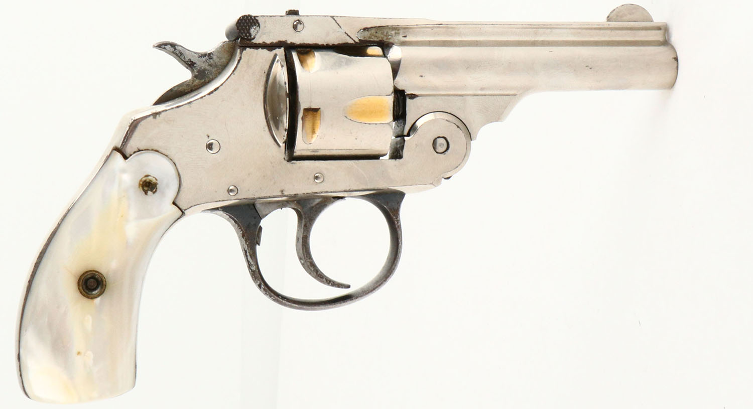 US Revolver Co., Top Break, CAL: .32 S&W, MFG: 1910-35, SN: 67171, Double Action Revolver, 3'' barrel. The Mother of Pearl grips are very good. Both grips have a small drilled indentation, from what appears to be an old inlay of a jewel or stone, otherwise excellent. The nickel finish rates appx. 90% on the barrel, with flaking toned to a brown patina near the break latch. The frame rates 95%, & the trigger guard has mostly worn to metal gray & toned to a brown patina. Bore is good, consistently rough, with intermittent pitting. Small notch rear sight & blade front sight. FFL or C&R Req. - Value: 100 to 250