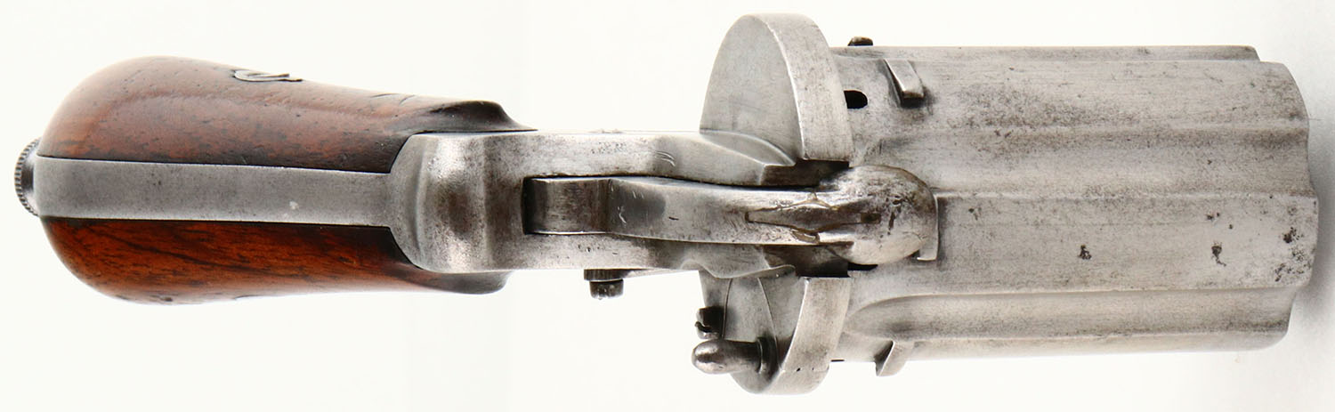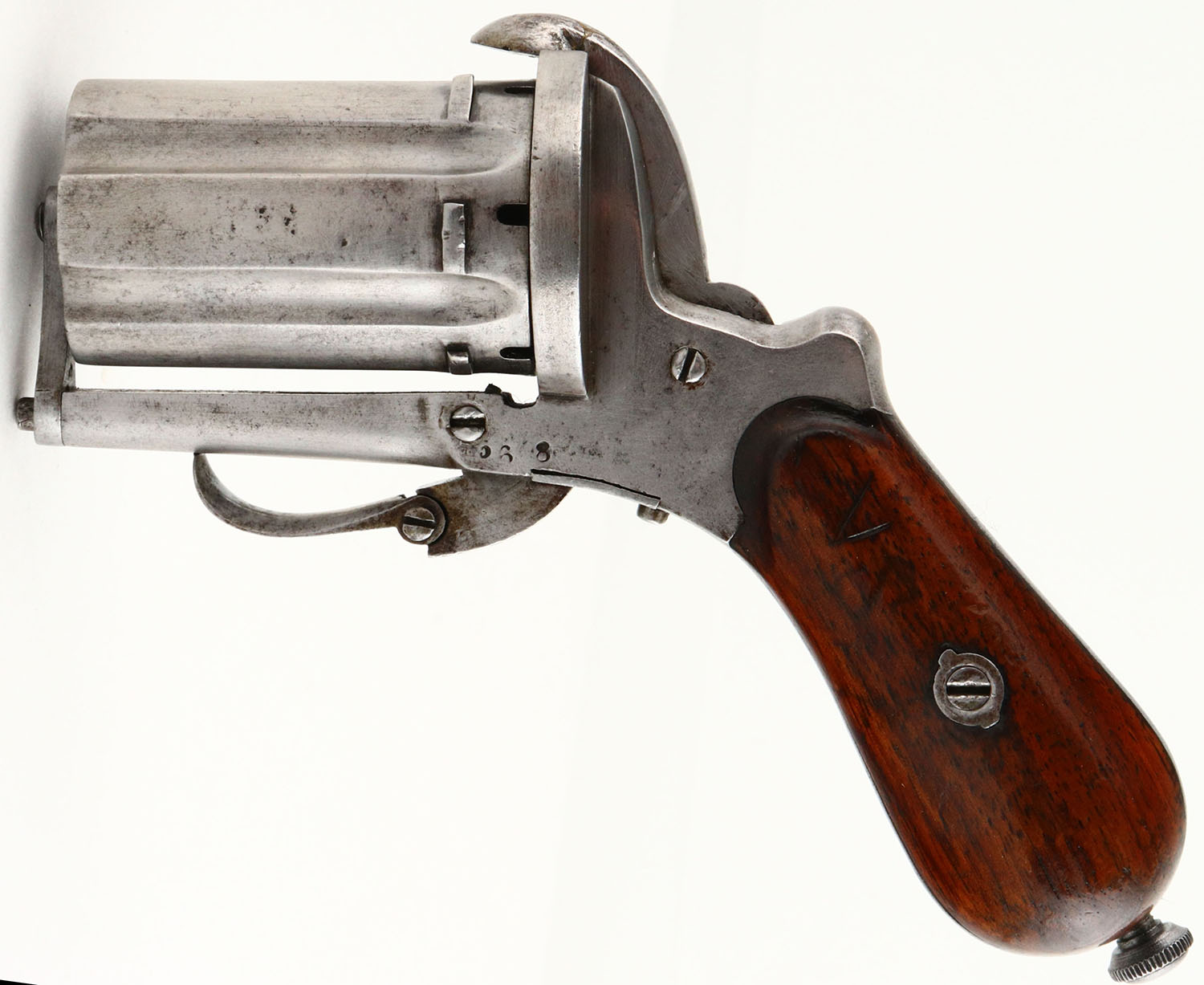Belgian, Pinfire Pepperbox, CAL: 9mm Pin Fire, MFG: Antique, SN: 568, Double Action Revolver, 2 1/8'' barrel cluster. Liege markings on the rear cylinder face & ''Crown/V'' on the front cylinder face. The SN can be seen on the left side of the frame. The wood grips are very good, having been lightly sanded & refinished at one time. There is a ''VS'' scratched into the top of the left grip. There are smoothed contusions & scrapes, with darkening from the added finish. The metal surfaces have fully worn to a clean metal gray, with intermittent spotting & speckling toned to a brown patina. Smooth bores range from good to very good, depending on the amount of roughness in the individual bore. No sights. Lanyard stud. Mechanical operation appears to function properly. A neat folding trigger pinfire revolver. Antique, No FFL Req. - Value: 500 to 1000