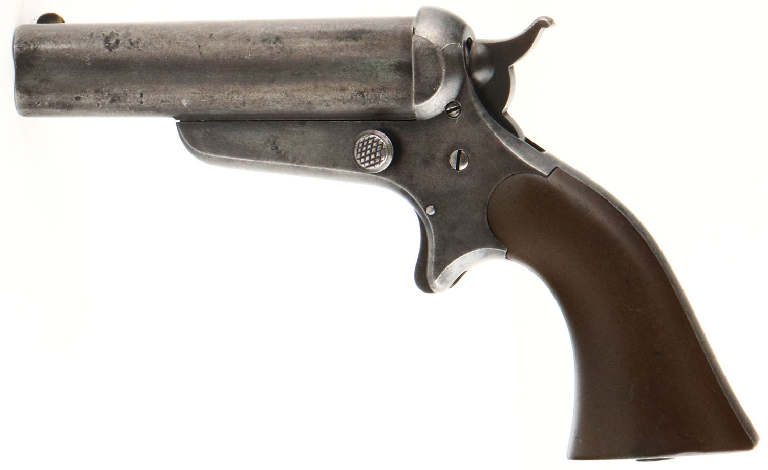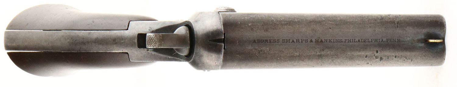 Sharps & Hankins, Model 3B 4-Barrel Pepperbox, CAL; 32, MFG: circa 1860's, SN: 4891, Single Action Derringer, 3 1/2'' barrel. The top of the barrel cluster is marked ''ADDRESS SHARPS & HANKINS PHILADELPHIA.PENN'', the right side of the frame is marked in two lines ''C.SHARPS PATENT JAN 25 1859''. The SN can be seen on the butt. The original Gutta Percha grips are very good & solid. There are some contusions, scrapes & dings. The metal blue finish on the barrel cluster has worn to metal gray, toned to a brown patina & there are remnants of remaining blue on the frame, mostly worn to metal gray & toned to a brown patina. Bores are good, still somewhat bright, with roughness & pitting. Integral notch rear sight & small blade front sight. The rotating firing pin does not rotate when the hammer is cocked. Other mechanical operations appear to function properly. SOLD AS IS NO RETURNS. Antique, No FFL Req. - Value: 800 to 1600