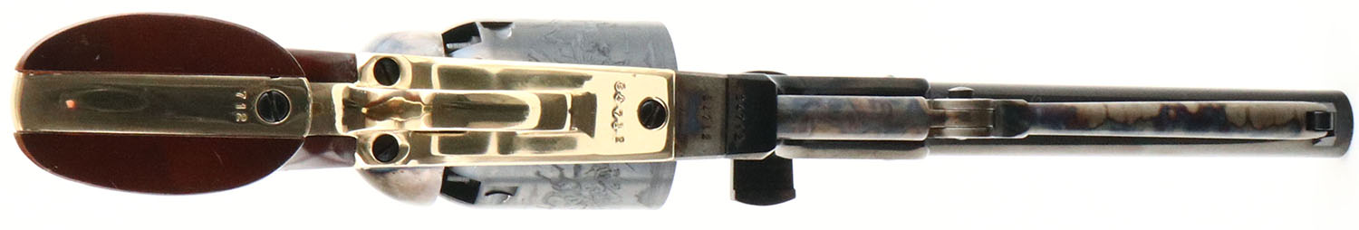 Colt Black powder Arms Co., USMR Model- Signature Series CAL: 44, MFG: Modern, SN: 34712, Single Action Percussion Revolver, 7 1/2'' barrel. The wood grips are excellent. There are some minor dings to the finish. The metal blue finish on the barrel & cylinder rates 99%. The case-hardened frame & ram-rod retain excellent case-colors, with some areas fading on the frame. Brass trigger guard is bright. Bore is excellent. Brass blade front sight.