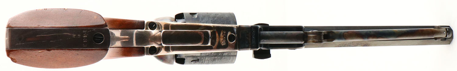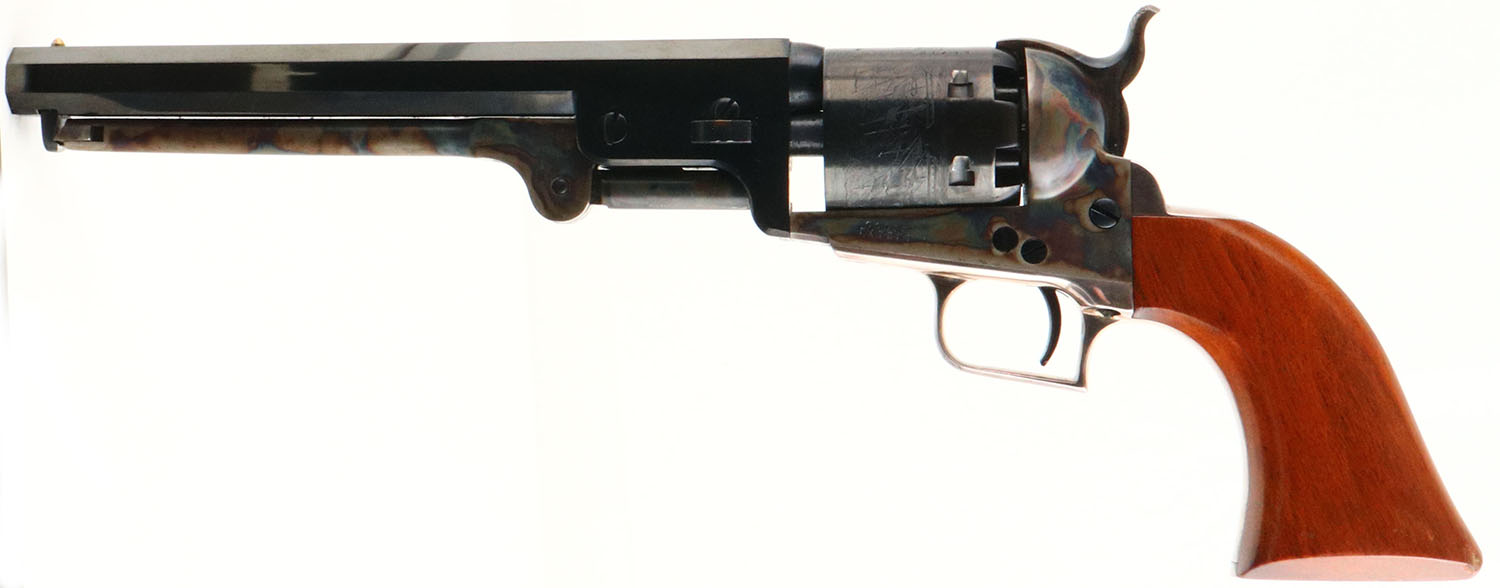Colt, 1851 Navy - 2nd Gen, CAL: 36, MFG: 1976, SN: 21433, Percussion Single Action Revolver, 7 1/2'' barrel. The top of the barrel is marked ''ADDRESS SAM L COLT NEW-YORK CITY''. The cylinder displays a crisp Naval ship scene, with the engravers name visible. The left side of the frame is marked ''COLT'S PATENT''. All matching SN can be found on the frame, barrel, trigger guard & butt. The wood grips are excellent, with a small edge chip & a few dings to the finish. The metal blue finish on the barrel & cylinder rates 99%. The case-hardened frame & ram-rod retain excellent case-colors. The silver tone trigger guard is excellent, with the right side under the frame fading to a brass tone. Bore is excellent. Small brass cone front sight. Comes in a custom wood case, with powder flask & dual cavity bullet mould. The top back edge of the lid has some damage, otherwise excellent. Black powder, No FFL Req. - Value: 500 to 1000