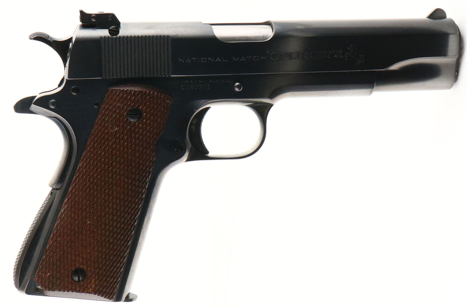 RARE & EXCEPTIONAL, Colt, 1911 National Match Pre-WWII, CAL: 45 ACP, MFG: 1938, SN: C190771, Semi Auto Pistol, 5'' barrel. The two-line address & patent dates are marked on the left side of the slide & ''NATIONAL MATCH COLT AUTOMATIC/CALIBRE .45'' followed by the Rampant Colt on the right. The right side of the frame is marked ''GOVERNMENT MODEL'' over the serial number, with ''60'' on the right side of the trigger guard & ''T/VP'' on the left. The checkered Walnut grips are near mint, with only a few minor handling marks. The original metal blue finish rates 98% overall. Bore is near mint. Factory added adjustable rear sight & blade front sight. Factory added ''New Safety Device''. This pistol comes complete with a Colt Factory Letter, confirming the configuration, date & details of the pistol. This is an extremely desirable pistol amongst Colt collectors & hard to improve the condition of this Pre-WWII National Match pistol. FFL or C&R Req. - Value: 7000 to 11000
