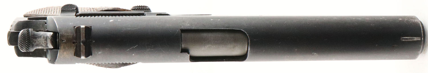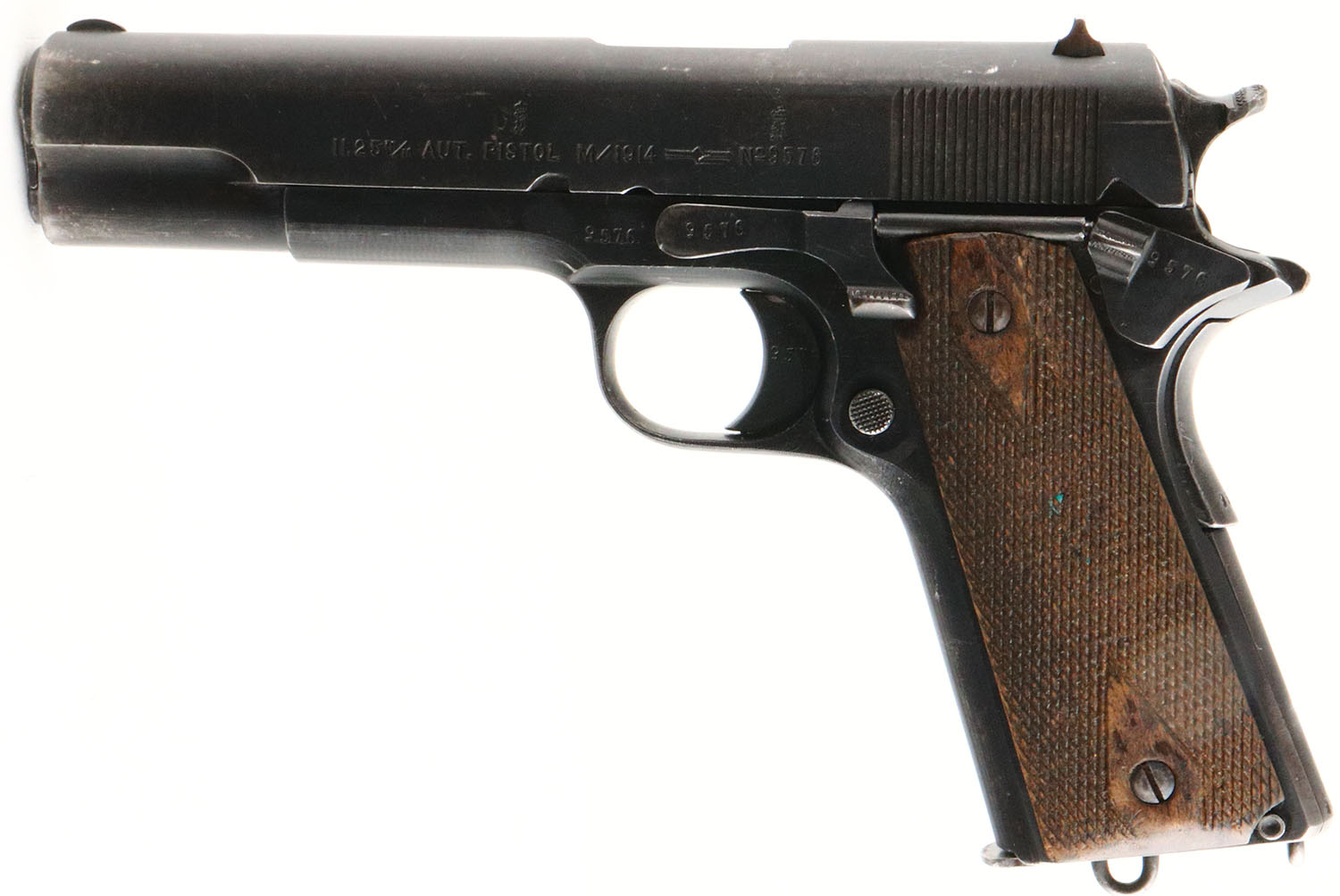 Condition: The checkered double diamond, wood grips are very good with wear, small dings, & scratches. The blued metal finish rates 80% overall with spots of holster wear at the end of the slide, finish thinning from hand wear, & various small scratches nicks, & wear spots from military use. The left side of the slide is marked with two Norwegian crown proofs, ''11.25m/m AUT. PISTOL M/1914'', & the S/N. the left side of the frame is marked with the S/N. the right side of the slide is marked ''1926'' & a proof mark. All Serialized parts are MATCHING other than the barrel which is a surplus GI, Colt M1911A1 barrel. The bore is Good its bright with worn, but still visible rifling. The slide holds a blade front sight with a U-notch rear sight. Pistol comes with one mag that has a lanyard loop, no markings. A nice example of miliary pistol with honest wear from use. FFL or C&R Req. - Value: 1000 to 2500