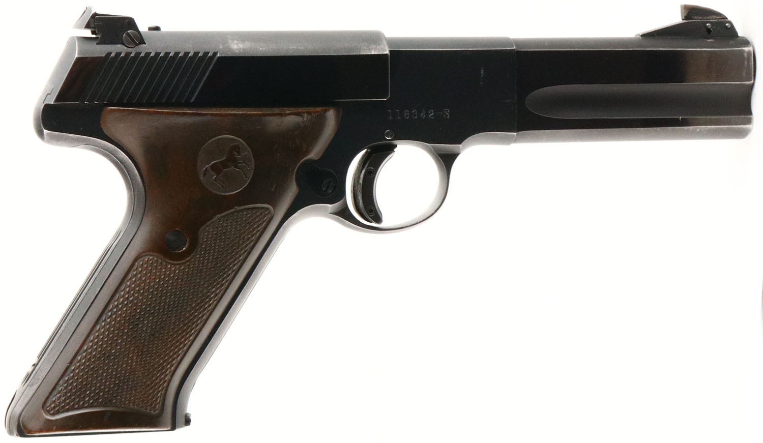 Colt, Woodsman 2nd Series Match Target, CAL: 22LR, MFG: 1952, SN: 118342-S, Semi Auto Pistol, 4 1/2'' heavy barrel. The original Colt wood checkered plastic grips are very good & solid. There are minor edge chips, scratches & scrapes. The original metal blue finish rates 90% overall, with light surface scrapes throughout & thinning around the muzzle & sharp edges. Bore is excellent. Adjustable rear sight & ramp elevated pinned blade front sight. FFL or C&R Req. - Value: 600 to 1000