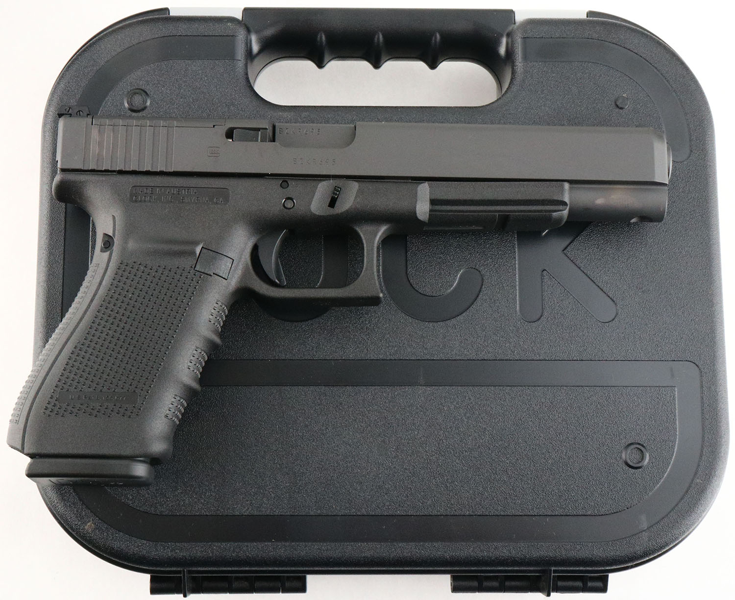 NEW CASED, Glock, Model 40 Gen 4 MOS, CAL: 10mm, MFG: Modern, SN: BZKR695, Semi Auto Pistol, 6'' barrel. The textured polymer grip & frame are mint. The factory matte black finish is mint. Bore is mint. Factory square notch white rear sight & single white dot front sight. Comes in the original factory hard case, with owners manual, lock/key, cleaning rod & brush, 2 grip attachments, MOS Adapter Set 02, (3) 15rd mags & speed loader. NOS. NIB. FFL Req. - Value: 600 to 900
