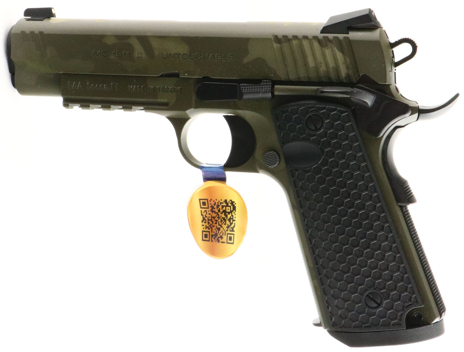 Girsan, MC 1911 C Untouchable, CAL: 9mm, MFG: Modern, SN: T6368-24CG00209, Semi Auto Pistol, 4 1/4'' barrel. The original honeycomb textured grips are excellent. The camo finish on the frame & slide is mint. Bore is excellent. Factory contrast sights. Factory magazine. Factory hang tag attached to trigger guard. FFL Req. - Value: 350 to 450