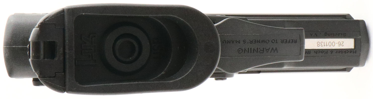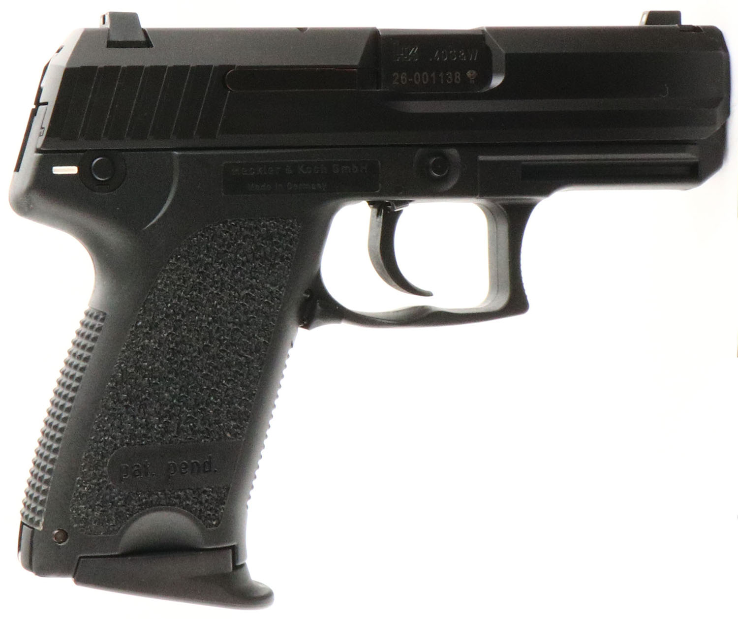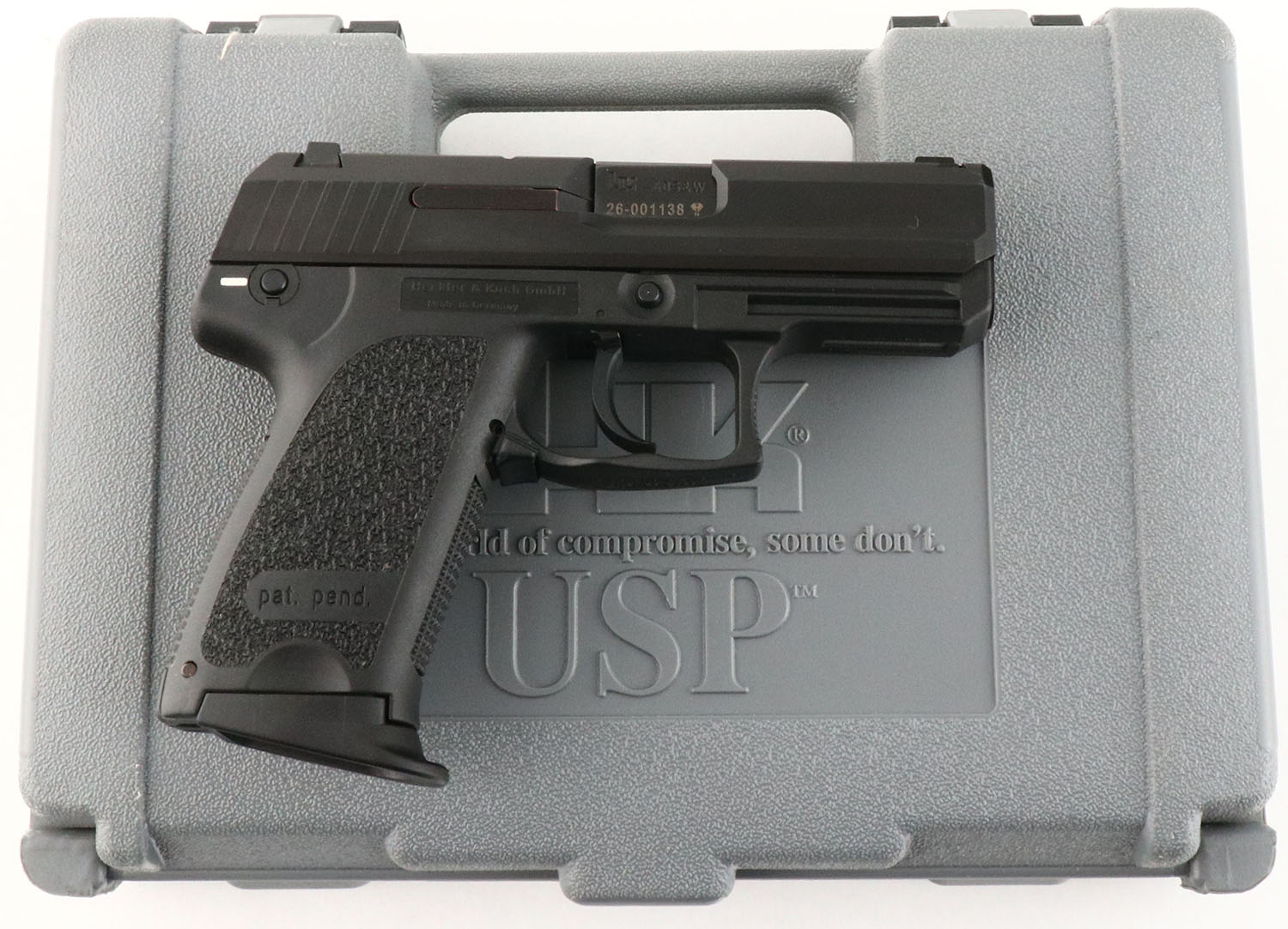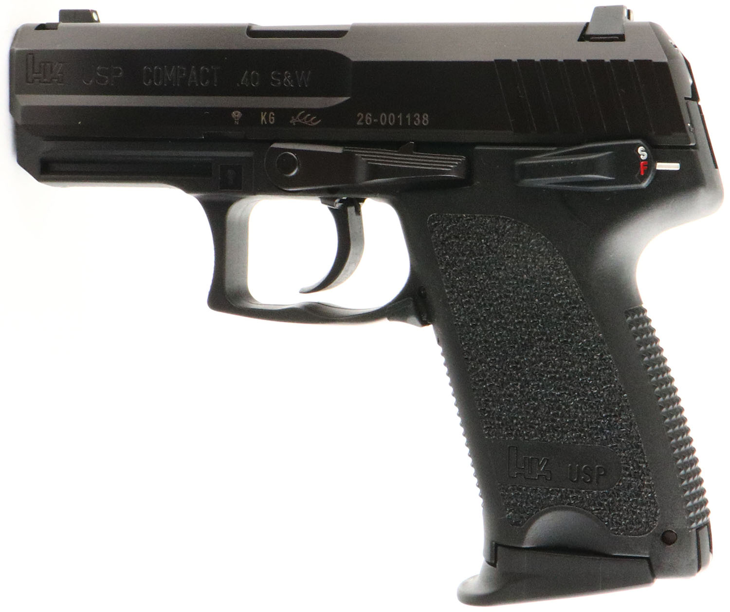 CASED, HK, USP Compact, CAL: 40 S&W, MFG: Modern, SN: 26-001138, Semi Auto Pistol, 3 1/2'' barrel. The textured polymer grip frame is excellent. The matte black finish on the slide rates 98% overall. Bore is excellent, with some roughness near the muzzle. Factory contrast sights. Comes in factory hard case, with related paperwork & extra mag. FFL Req. - Value: 400 to 600