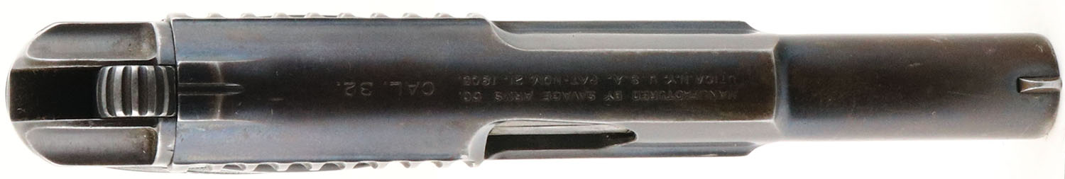 Savage, Model 1907, CAL: 32 ACP, MFG: 1907-20, SN: 81187, Semi Auto Pistol, 3 3/4'' barrel. The Savage checkered plastic grips are good & solid. There are scrapes, contusions & a small edge chip on the right grip & the grips have rubbed smooth in areas, mostly around the Savage logo & the top of the grips. The original metal blue finish on the barrel rates 30%, worn to metal gray & toned to a brown patina & the frame rates 60& , with areas worn to metal gray & thinning toned to a brown patina. Small U-notch rear sight & small blade front sight. No magazine. FFL or C&R Req. - Value: 200 to 400