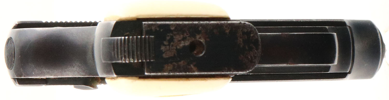 Soc. IT. F.LLI Galesi, Model 9, CAL: 25 AUTO (6.35), MFG: 1963, SN: 373072, Semi Auto Pistol, 2'' barrel. The AG faux ivory grips are good, with multiple small cracks, contusions & dings. The metal blue finish on the slide rates 60% & the frame rates 80%. Bore is excellent, with visible light wear. U-notch rear sight & small blade front sight. FFL or C&R Req. - Value: 50 to 150
