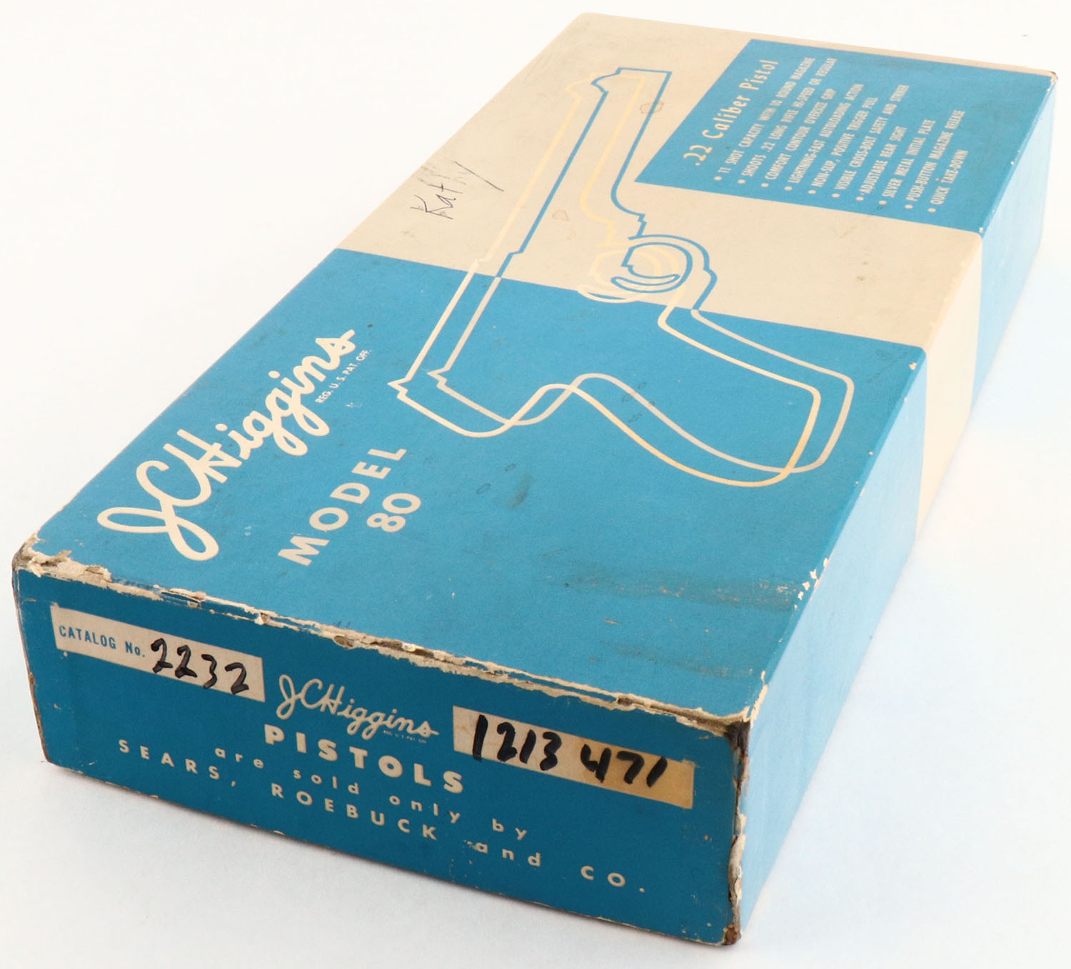 BOXED, JC Higgins, Model 80, CAL: 22LR, MFG: 1955-61, SN: 1213471, Semi Auto Pistol, 6 1/2'' barrel. The synthetic checkered target grips are excellent. The metal blue finish rates 98% overall, with an area on the right side of the barrel beginning to tone brown. Bore is excellent. Square notch rear sight & serrated blade front sight. Original magazine. Comes in factory box, with related paperwork, cleaning rod & tool. - Value: 200 to 300