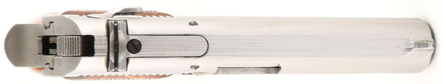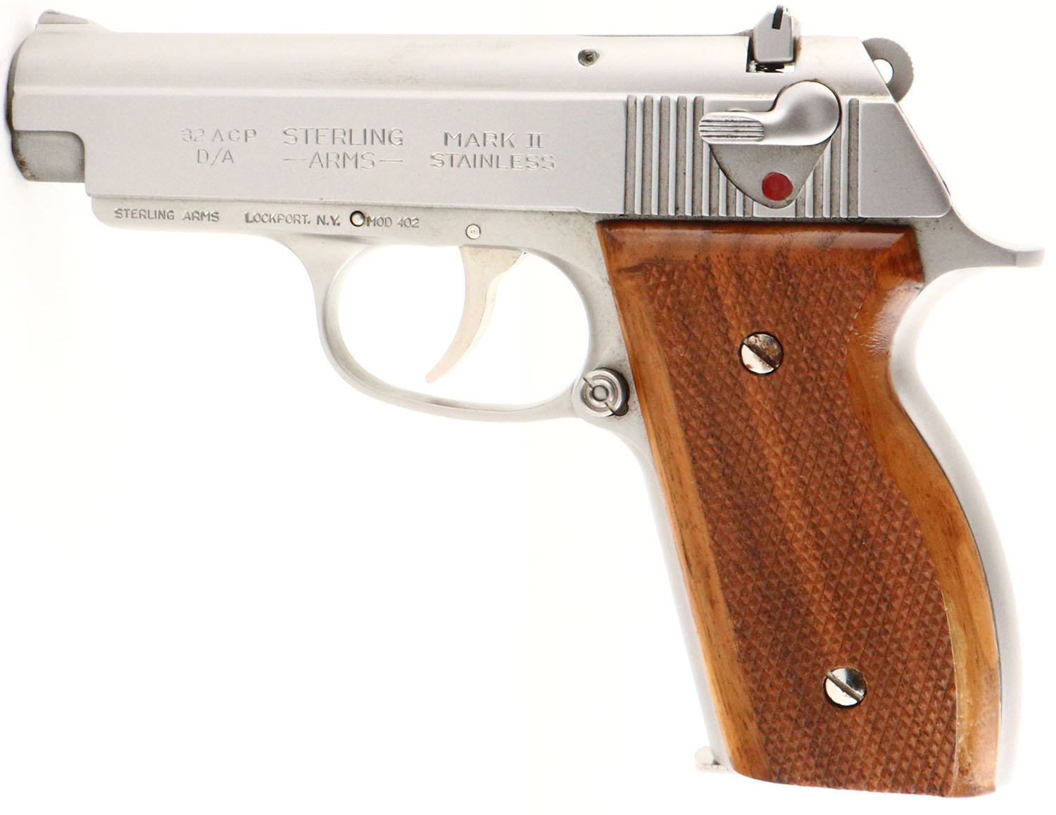 BOXED, Sterling Arms, Model 402 Mark II Stainless, CAL: 32 ACP, MFG: 1974, SN: CO1175, Semi Auto Pistol, 3 1/2'' barrel. The checkered wood grips are excellent. The stainless steel finish is excellent overall. There are a couple minor spots of cleaned rust spotting. Bore is excellent. Adjustable rear sight & integral serrated blade front sight. Comes in factory SN matching box, with related paperwork. Box condition is very good, with tape repairs. FFL Req. - Value: 150 to 300