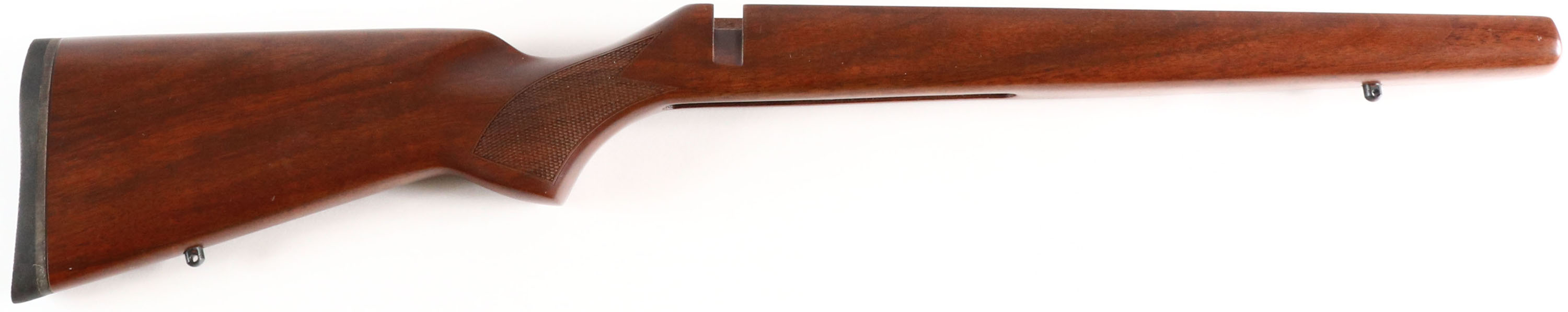 Wood rifle stock, for .22 Cal rifle, checkered wrist, rubber recoil pad. Front & rear sling studs. Grade: Excellent - Value: 10 to 100