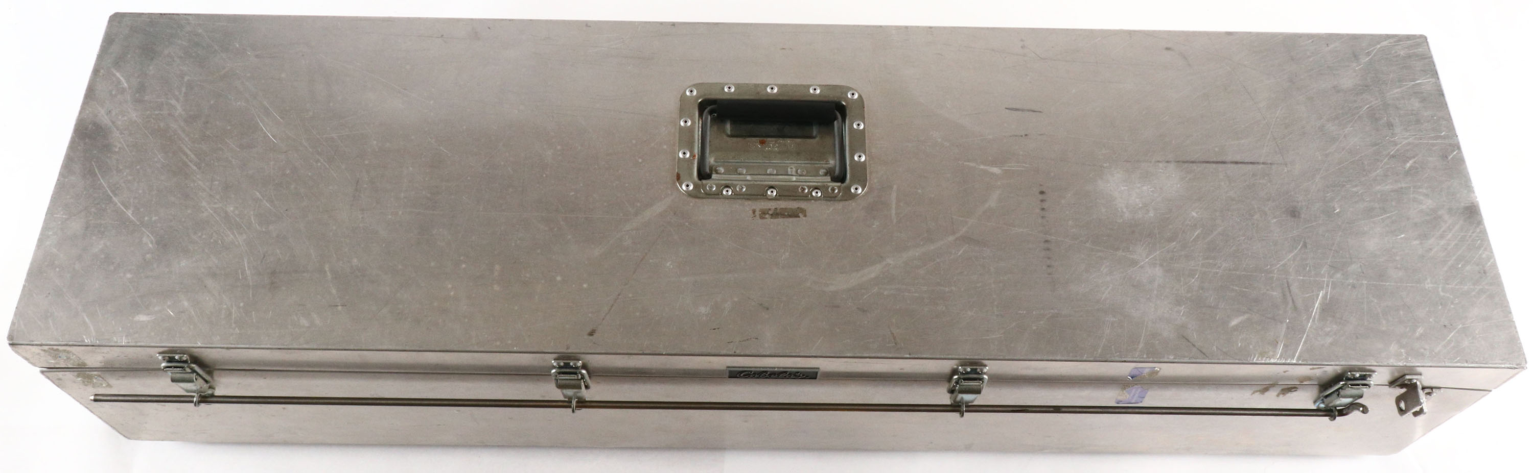 Cabela's, Aluminum rolling & locking gun case, holds up to 6 long guns, (3) aluminum dividers, has handles at top and end, wheels on end, 1/4'' security bar, all (4) latches have provisions for padlocks, inside is minty, OD: 52'' x 14'' x 10 3/4''. Grade: Excellent - Value: 40 to 200