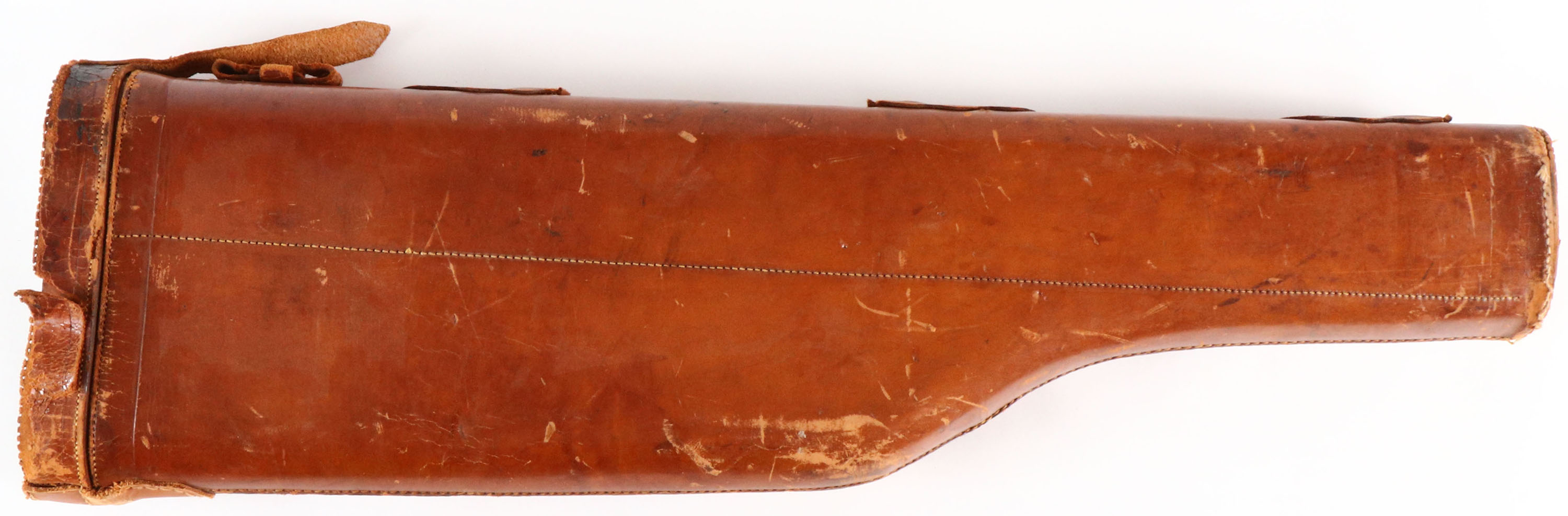 Leather long gun scabbard, missing the end cover & handle, green felt inside, OD: 34'' x 10''. Grade: Very Good ++ - Value: 6 to 60