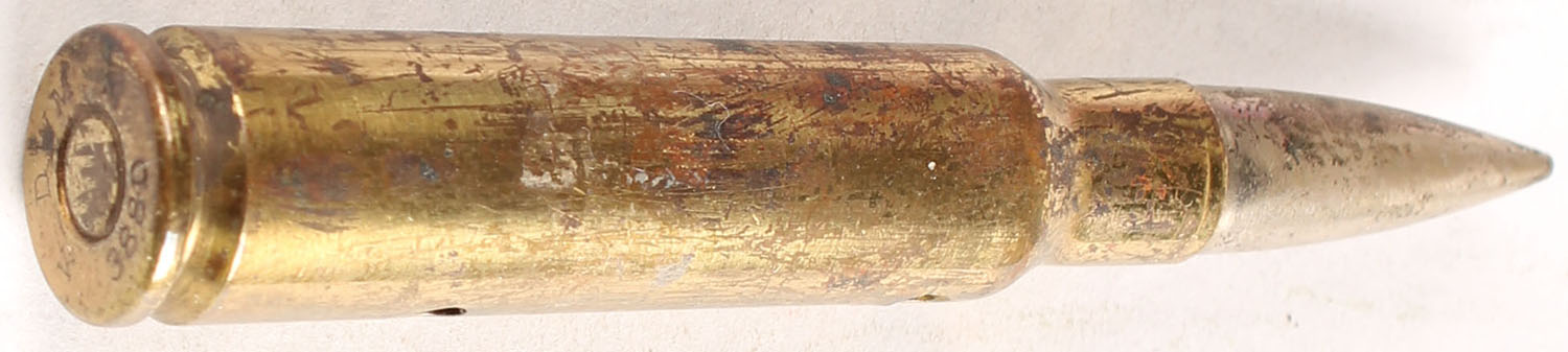 8x56 Schmidt Rubin. HS:''DWM K 388D K. PT CN FMJ. Two holes in case. Scarce loading. Grade: Very Good ++ - Value: 10 to 100