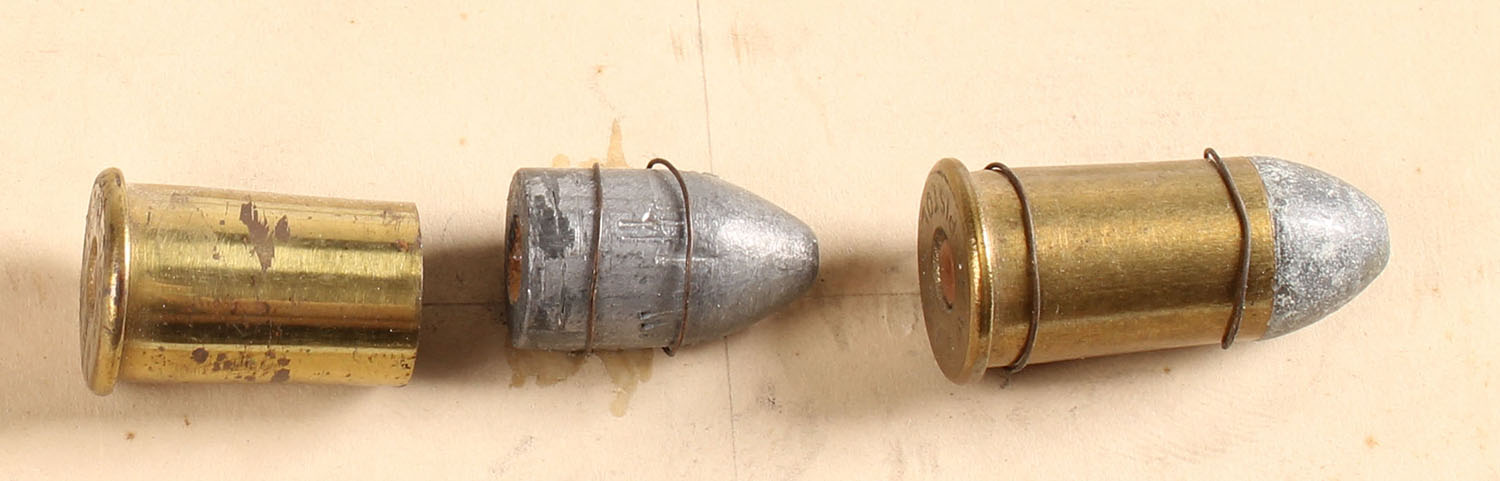 Winchester Exposition Display Board. .50 Pistol. Hard fiberboard with an empty cartridge, a projectile and a dummy loaded round. These boards were displayed by Winchester at various Sportsman's Shows in the early 1900's to show the public their line of ammunition. This board is believed to have been displayed circa 1914. - Value: 70 to 150