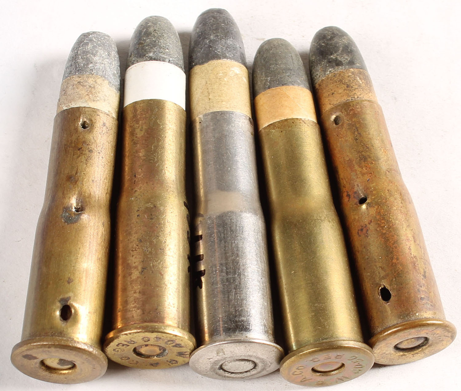 Lot of 5. 40-50 Sharps bottleneck. (2) HS:''W.R.A. Co. 40-50 REG.'', FN PP Lead--2 different bullets. (2) NHS, Board Dummies with mounting holes. (1) NHS, Nickel Case, FN PP Lead. - Value: 70 to 140