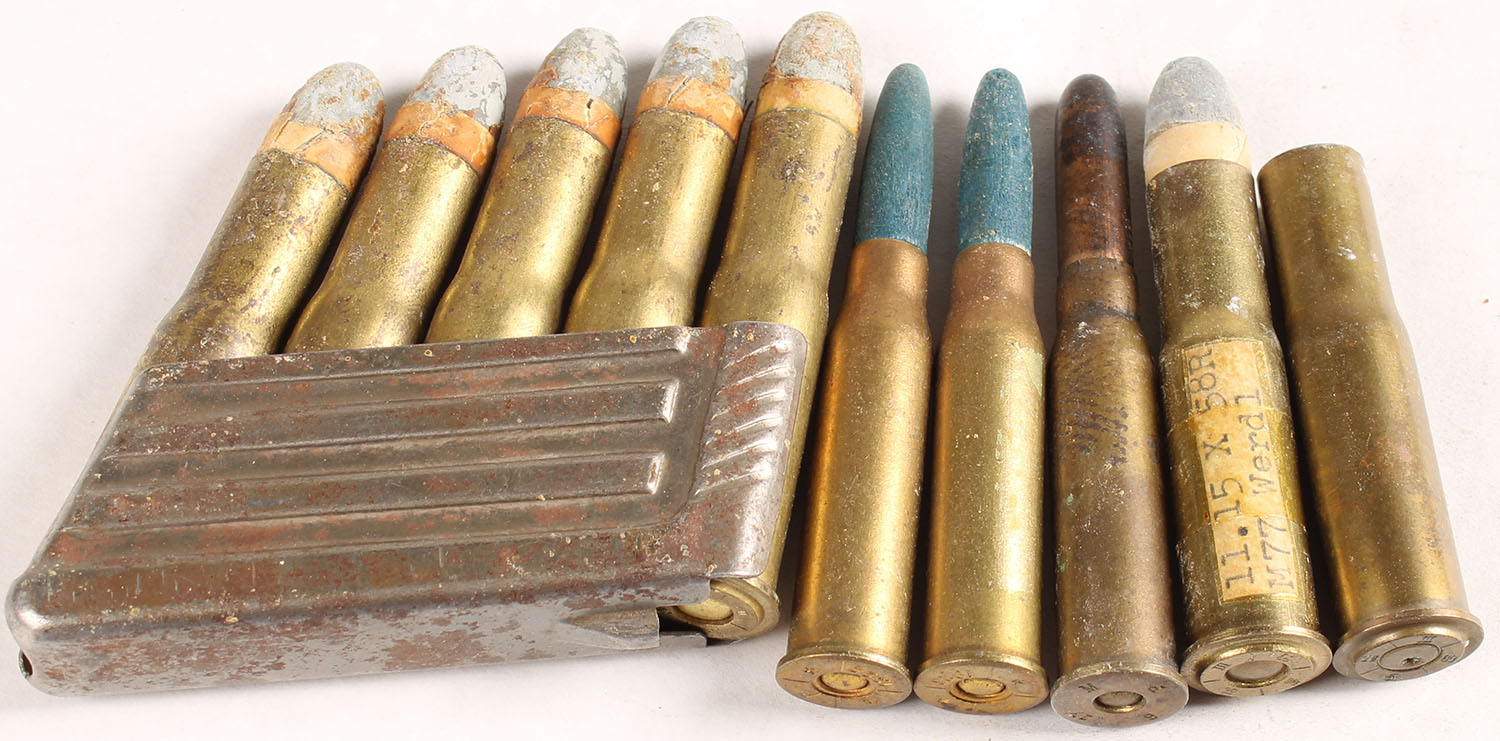 Lot of 9. Austrian military cartridges. (6) 11mm Werndl. Mixed military headstamps including Corneides, Berndoerfer and the Austrian State Factory, Five of which are loaded in standard Werndl charger. RN PP Lead. (2) 8x50mm Mannlicher, HS:''P / * / 1922 / *'', Blue wood bullet. (1) 8x50mm Mannlicher, HS:''17 M P 6'', RN CJ FMJ, by Polte. - Value: 20 to 30