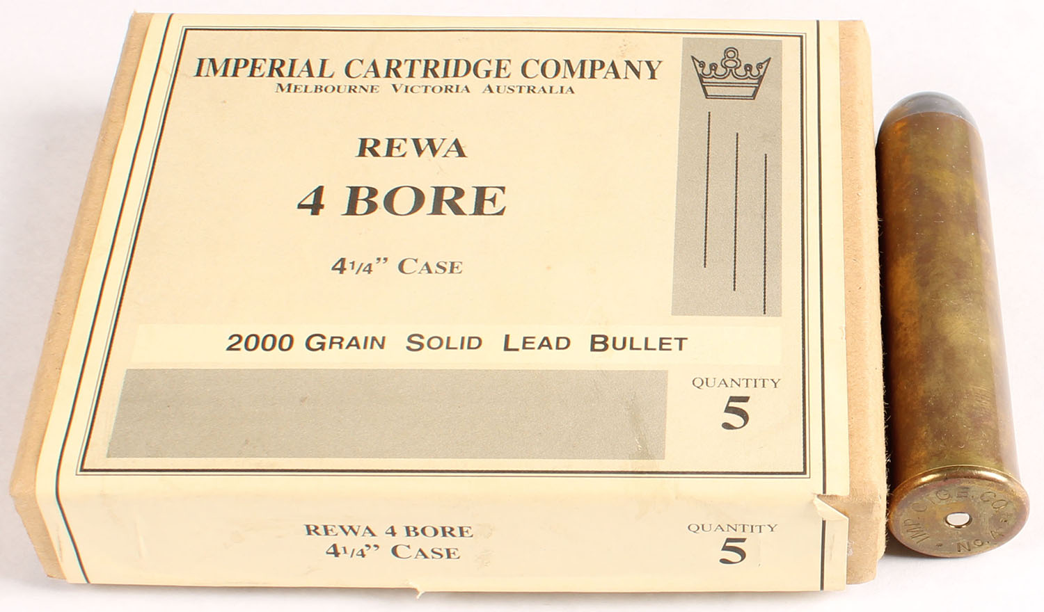 Imperial Cartridge Company, Melbourne Victoria Australia Rewa 4 Bore in original box, 4 1/4'' case, 2000 grain solid lead bullet, only 1 in box, NOT A FULL BOX. Grade: Very Good ++ - Value: 40 to 200