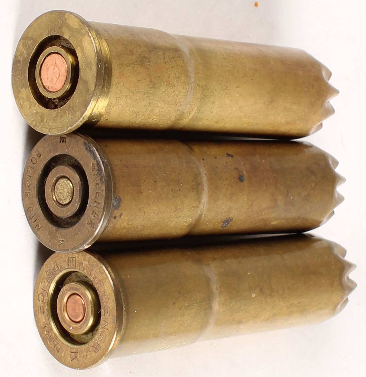 Lot of 3. 14 Special Gauge for the falling block Greener Police Shotgun. (2) HS:''GREENER K POLICE GUN E'', (1) HS:'' arabic script''. 10 petal crimp over cardboard wad. At least two are loaded with SG shot. Grade: Excellent - Value: 30 to 80