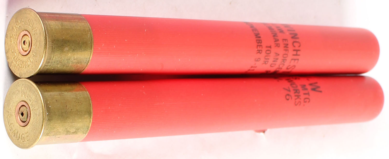 | Lot of 2 12'' long loaded shotshells, all solid. Grade: Excell...