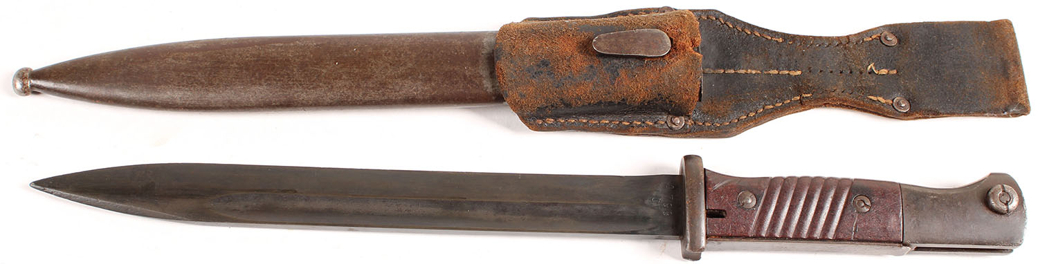 German, Genossenschafts Maschinenhaus der Buchsenmacher Ferlach Austria, M1884/98 third pattern (K98k) bayonet with sheath & frog. The bayonet has light wear, the left side of the blade is marked ''bym'', the spine is marked ''44'', & the right side is marked ''1798'', ''C''. The leather frog has a tear in the sheath retention spot. The leather is starting to crack & fray from age but is still malleable. Grade: Excellent + - Value: 80 to 160