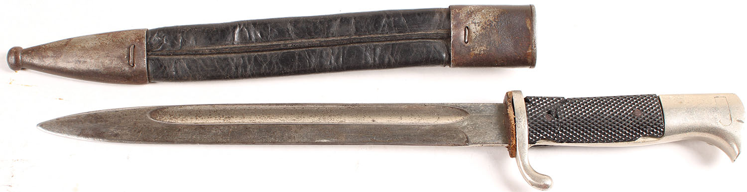 German, M1898/05 Dress/parade Bayonet, comes with leather & steel sheath. All metal parts have been chromed. The blade has spotty patina, the left grip has cracks & chips. Blade has no markings. Grade: Very Good - Value: 20 to 120