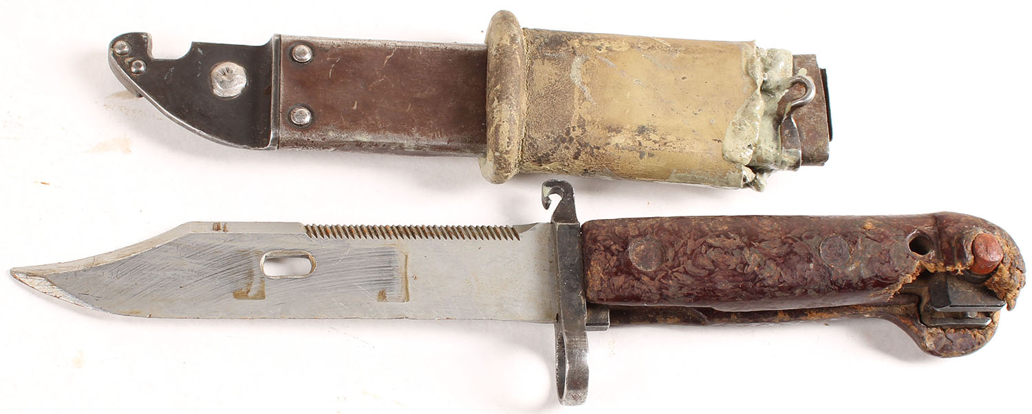 Romanian, AKM type 1 (M1959) bayonet, with sheath. The guard is marked ''ZL 2369'', sheath does not S/N match the bayonet, bayonet & sheath have this gray residue on them. Damage to the handle on the bottom right. Grade: Very Good + - Value: 30 to 60