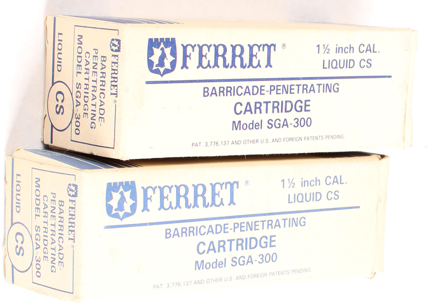 Lot of two, AAI Corp., Ferret, 1 1/2'' Liquid CS cartridges, Model SGA-300, both in boxes, wrapped in foil, & are loaded. Grade: Excellent - Value: 8 to 20