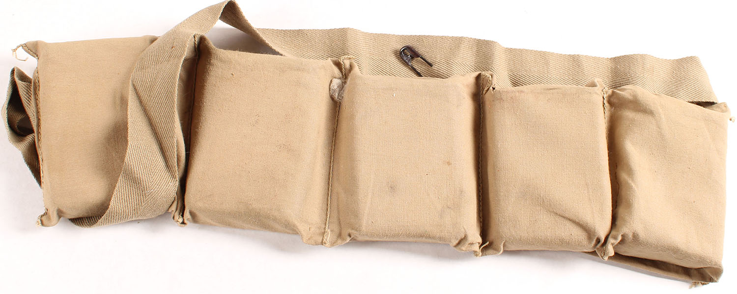 US, 6 Cell Bandoleer, 5 cells filled with 10 Rds. Of .30-06 on five Rd. brass clips, 50 total Rds.. Ammo is Frankford Arsenal dated 1938. no markings on the bandoleer, ammo is Very good, some Rds. Have light corrosion. Grade: Excellent + - Value: 60 to 120