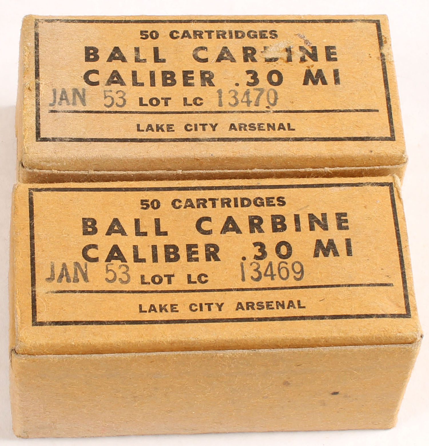 Lot of two, Lake City, .30 carbine M1 Ball, 1pc, both Full. brown boxes with black print, boxes have stains & wear, ammo is very good. Grade: Excellent - Value: 40 to 80
