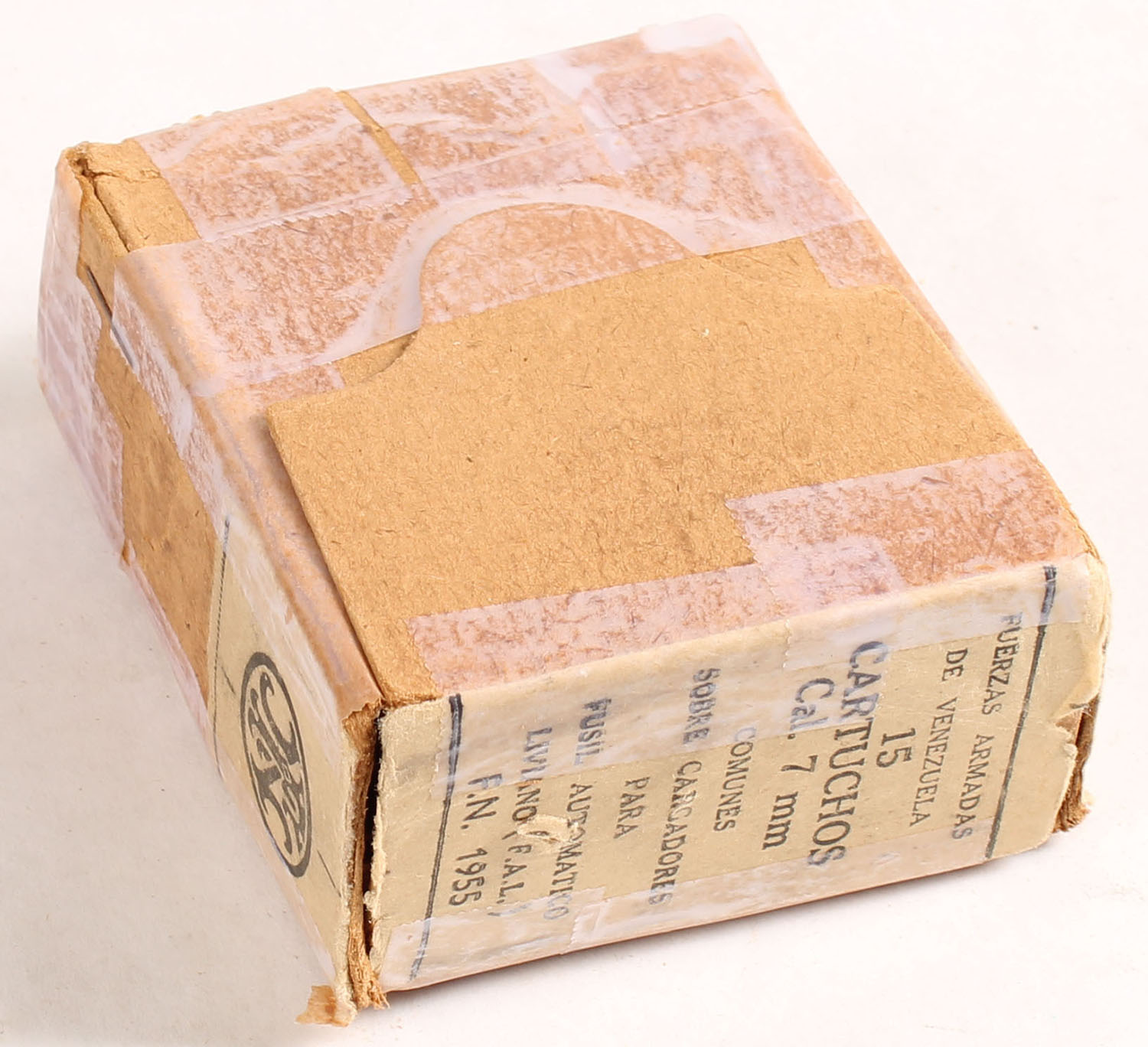 FN, 7x49mm for FAL rifle, F.N. 1955, in clips, 1pc, Full, 15 Rd. box, brown box with buff label & black print, box is solid with tape repairs, has been taped sealed, bottom of box missing. Grade: Very Good + - Value: 16 to 30