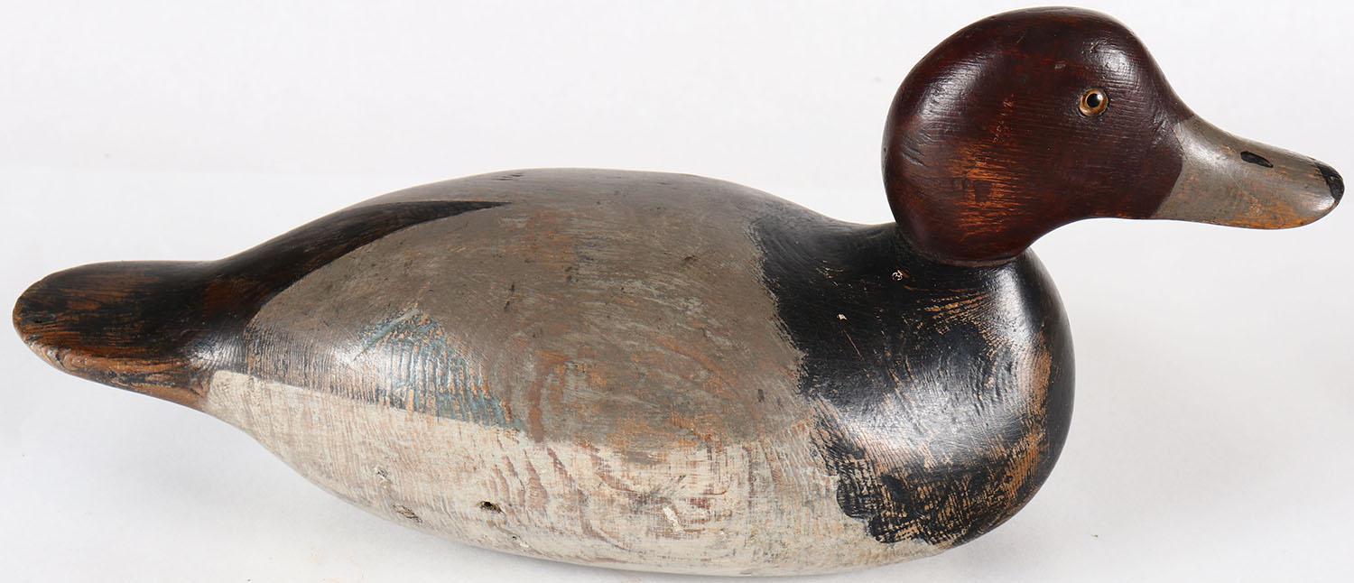 Redhead Drake by Mason Decoy Company, Detroit, MI, 1896-1924, Standard Grade, glass eyes, solid wood, repainted, has a filled age crack on bottom, structurally excellent, 14 1/4''