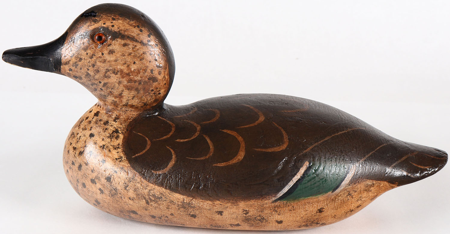 Greenwing Teal Hen by Mason Decoy Company, Detroit, MI, 1896-1924, Standard Grade, glass eyes, solid wood, repainted, structurally excellent, 12 3/4'' OAL. Grade: Excellent - Value: 100 to 200