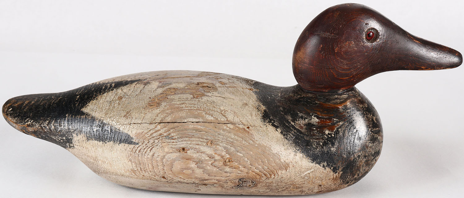 Canvasback Drake by Mason Decoy Company, Detroit, MI, 1896-1924, Standard Grade, glass eyes, solid wood, taken down with repaint, bill tip is blunted, structurally excellent, 15'' OAL. Grade: Very Good ++ - Value: 60 to 100
