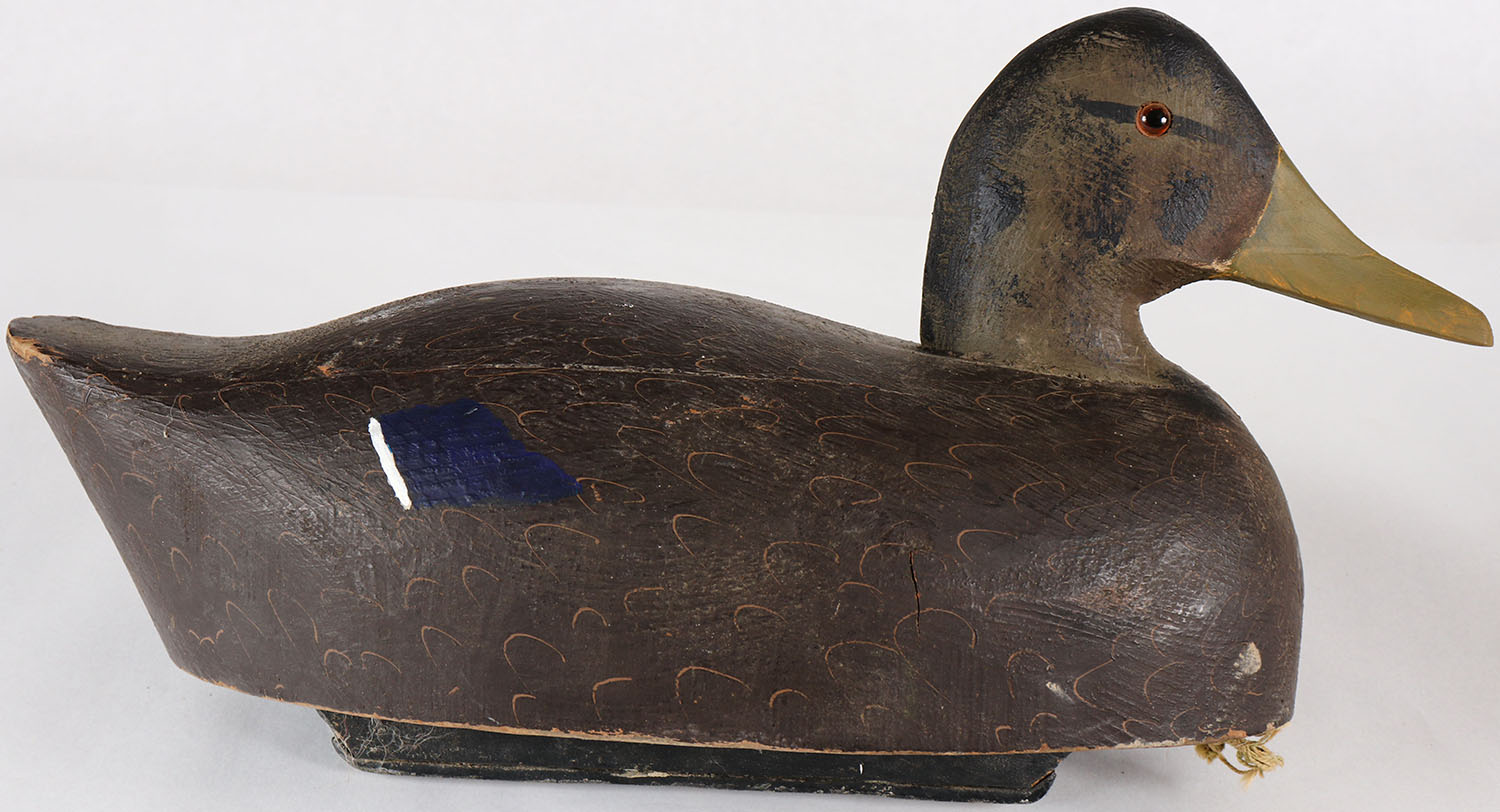 Black Duck by unknown maker, GE, solid wood, original paint on body with repaint to repaired cracked bill, shows some feather detail has keel, 14 3/4'' OAL. Grade: Very Good ++ - Value: 40 to 80