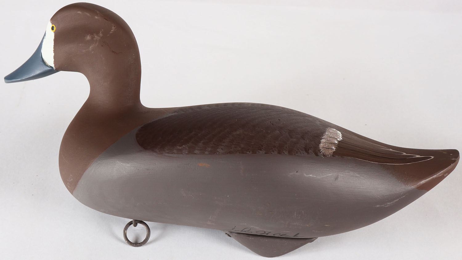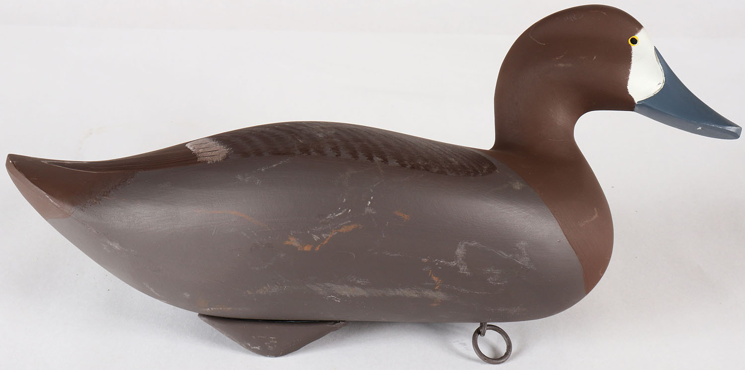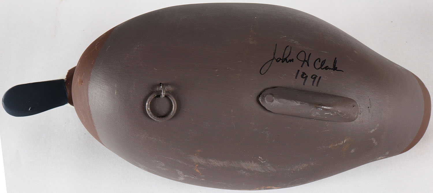 Bluebill Hen by John H. Clark, Havre De Grace, MD, painted eyes, solid wood, original paint, structurally excellent, signed on bottom, 14 1/2'' OAL. Grade: Excellent + - Value: 30 to 60