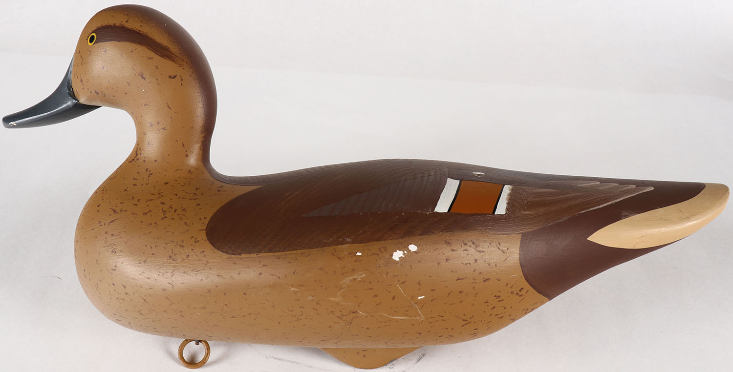 Pintail Hen by Patrick Vincent, Churchville, VA, painted eyes, solid wood, original paint, structurally excellent, signed by PATRICK VINCENT on bottom, 16'' OAL. Grade: Excellent ++ - Value: 30 to 60